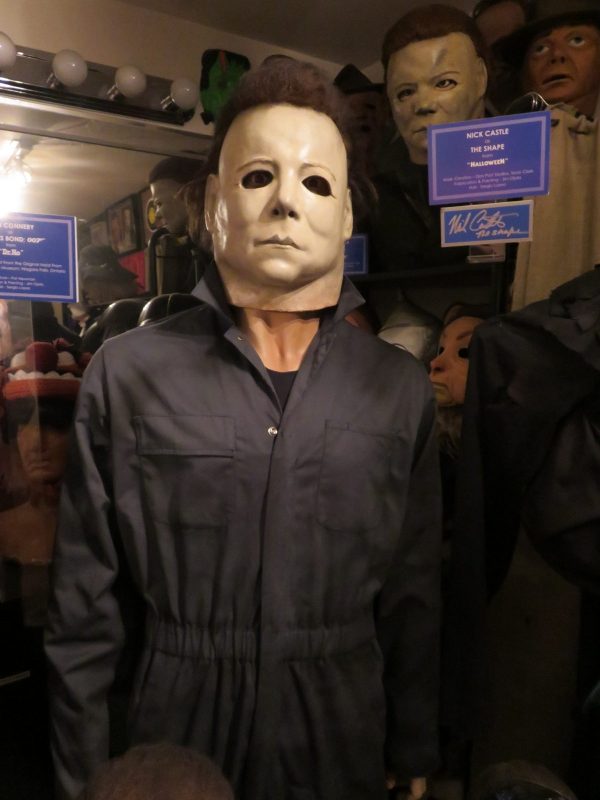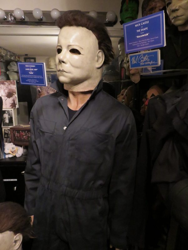 Sunday the 1st – MONSTERPALOOZA: DAY 3! – After lugging my final bags to my car and stashing them, I checked out of the hotel and headed to the convention. My voice was actually doing MUCH better. I’m sure the vocal rest helped immensely. I turned on the Scaramanga light and eventually met up with my pal Sergio Lopez. Sergio does the hair on all my mannequins, so he wanted to check out how Roger M00re looked in the museum. I’ve known Sergio for about 21 years, as we first met when I was doing Beetlejuice at Universal Studios, and Sergio was the wig guy. As Sergio and I walked the floor we saw a familiar face from our past. Scott Fresina, who played Frankenstein in the “Beetlejuice Graveyard Revue” was chatting with a buddy of mine. Sergio and I hadn’t seen Scott in many years, so we had lots of laughs talking about the old days. We hung out a bit with Dan Roebuck, Sara arrived to enjoy the final throes of the convention, and it was a fun, but exhausting day. The weekend seemed to fly by, except for the last hour. Sergio and I sat down waiting for 6pm to roll around (when the show closes) so I could start breaking everything down in my museum exhibit and head home. But the final hour just seemed to creek along at a snail’s pace. Once the show closed we headed to the museum, Sara brought in all the boxes so we could pack everything up, and we spent about an hour tearing down. Luckily, because the show had just ended, it was nice and cool in the museum room! (Not like set-up day!) Sara did an amazing job helping me break everything down and load it into her car. My car was loaded full of my luggage and Darth Vader costume, so we needed her SUV to take all the Roger M00re stuff to my house. I drove home and met up with Sara, loaded everything into the garage, and I went inside to put a few things away and crash! When I got up later my voice problems had come back (probably from all the talking I did during the day at the convention). I drank some hot water and relaxed. I wasn’t in the mood for a WOG because my feet hurt so badly. I unpacked and got settled. I’m looking forward to resting for a couple of days. All of the excitement leading up to the convention, coupled with the convention itself, was really quite exhausting (but FUN!). I couldn’t resist setting up the Roger M00re figure in my living room. He looks fantastic! I also broke down my life-size Michael Myers mannequin and put on the new coveralls I had just bought at the convention! I had a pair of blue coveralls on him for the longest time, but I met an expert in the field who had a booth called Creepy Customs. He assured me that the coveralls I needed were in a specific “screen-accurate” color, and with the proper amount of weathering. I grabbed them at the convention and couldn’t wait to see how they looked on my figure. As expected, they looked totally amazing! After that I showered up, and hit the hay in hopes that I could sleep for a week!