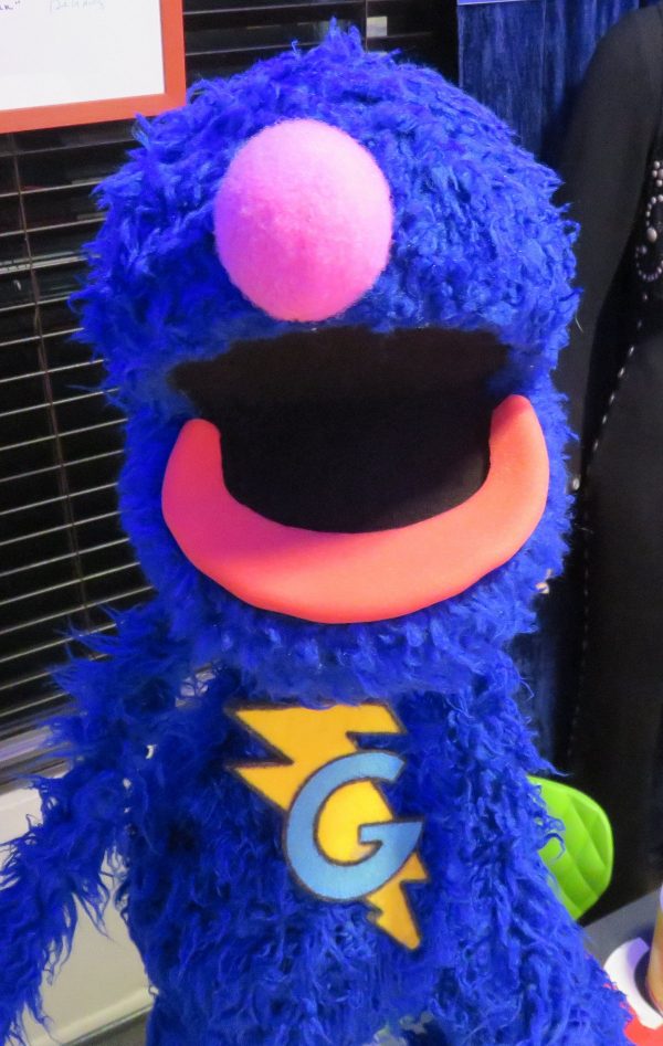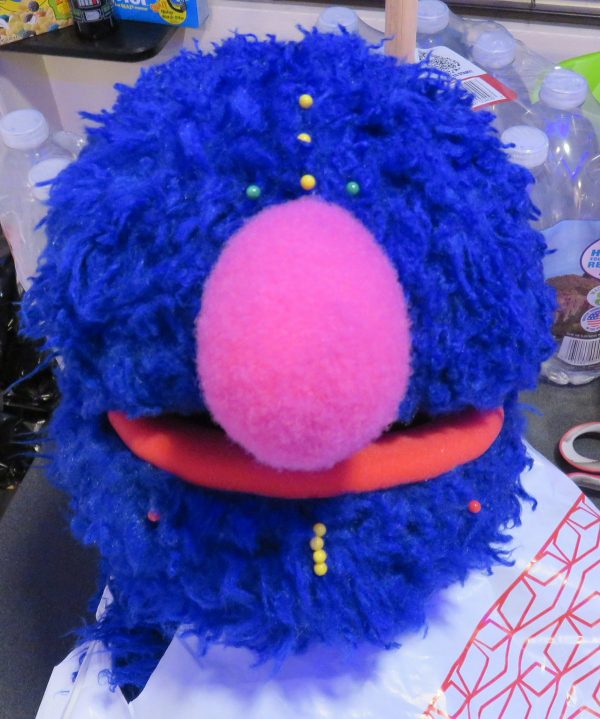 Thursday the 1st – THE FINAL TOUCHES! – To get some supplies for the weekend, I walked over to the grocery store to stock up. I like to have things like bananas, oranges, pop tarts and blueberry muffins in my hotel room to enjoy as, what I call, “Con Breakfast.” It’s usually better and faster than waiting for the hotel’s room service. I did some work around the house, and then went to Alex’s to pick up Grover. She won’t have his helmet completed until Friday morning (just under the wire) as it takes the latex and paint quite a while to dry and cure properly. But I needed to have the Grover puppet itself in my possession today so I could complete the lower “horseshoe” lip and the eye pieces. I got back home and did my nightly auditions, and then grabbed a nap. Then I got up to spend the rest of the night working on completing Grover. I’ve been thinking about how to make his lower red “horseshoe” lip for quite a while, and months ago I created a pattern and a test piece that I really liked. But at the last minute, earlier in the day, I decided to change the pattern just slightly. As I’ve always said, in puppet building, 1/32” of an inch can make all the difference sometimes. It’s like getting the exact proportions and sizing of the helmet correctly. While the foam rubber lip piece I had made as a test looked pretty good, I decided to fatten up certain areas of it just a bit. I took the freshly redrawn pattern and cut a new piece out of some ¼” foam rubber that I had dyed red. I glued it up and it looked much better than the original test piece. I marked the center lines on the puppet’s head so I could have registration marks to make sure everything was even. I also marked a center line on the underside of the lip piece, and lined it up with the puppet, and glued it into place in 2 inch sections. I had to glue it down all the way around the outer edge of the lower mouth plate, so I wanted to take my time and do it in sections to ensure accuracy. It took a while, but it worked out VERY well and looked spectacular. The finishing touch was placing the eye pieces in the puppet’s head. As my old pal Terry the contractor used to say (may he rest in peace) “Measure twice, cut once.” I knew I wanted one inch of space between the eyes, but I had to determine the exact height of the eye pieces in relation to the nose. I marked the spots, trimmed the fur where the eye pieces would be glued down, and poked the hole through the fur and the foam rubber head to insert the prong that’s on the back of the plastic eyepieces. But as I took the small scissors to make the hole, I accidentally poked them through too fast and snipped the first pad on the index finger of my left hand which was inside the puppet head. OUCH! I bled for quite a while. I wrapped my finger and continued on. But on one of the eye pieces I saw a tiny red speck that I couldn’t get off. So I switched to another back-up eyepiece. Until I realized that the red speck was some of my own blood, which I then removed from the eyepiece with a wet Q-tip. Ugh. When I say my blood and sweat goes into making these puppets, I’m not kidding. The eye pieces got seated and glued into place and I acquired the perfect slant for them. Now it was time to make the pupils. I cut two pupils out of a sticky-backed black velvet that I use for pupils; one was 5/8” and the other was 3/4”. I have a neat hole punch kit that I can just hammer the pieces out of the fabric without having to try to cut perfect circles by hand. I placed each of the eye pieces up on the puppet’s eye pieces to see which one was the better size. Grover’s eyes have changed over the years, and his pupils have gotten a little smaller and beadier over time. But since I’m going for the look of the 1970’s Grover (the one I used to enjoy watching as a kid) I decided to go with the bigger 3/4” pupils. Like I said before, sometimes a fraction of an inch can make all the difference in this craft. I placed guide tapes on the eye pieces to make sure the pupils would get placed in the exact spot on both pieces, and glued them down. BEAUTIFUL! I packed up a bag of snacks to take to the convention, and then I hit the hay. I’ve got to be up really early to hit Alex’s shop in the morning to pick up the helmet, do some extra packing, and then head to Pasadena for a Monsterpalooza weekend!