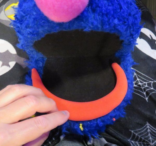 I cut Grover’s lower lip out of red foam rubber, and then doubled it over on itself and glued it down.