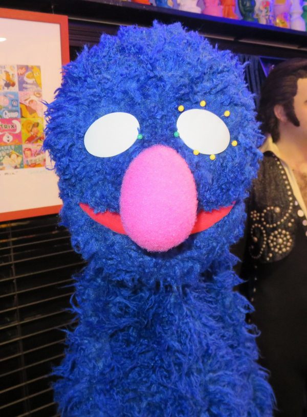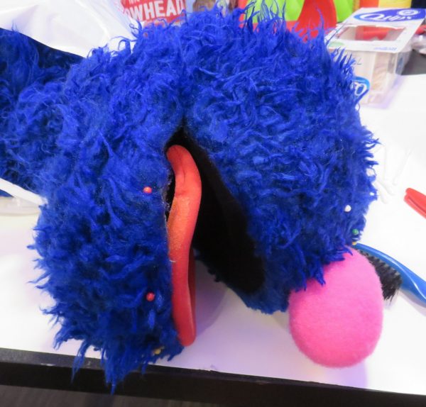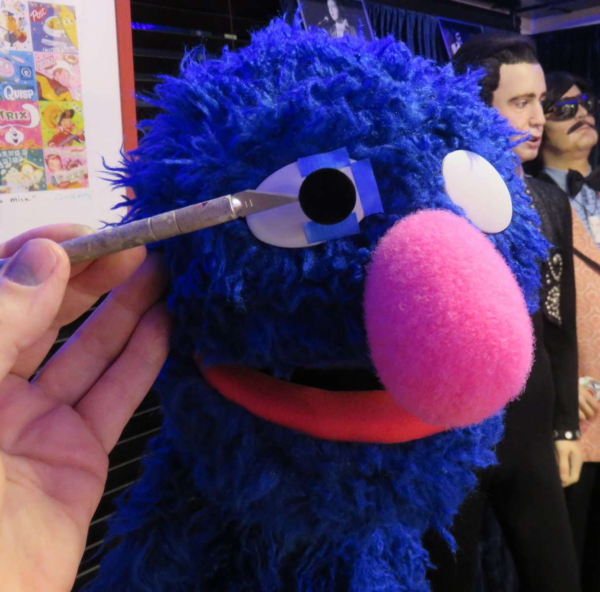 Thursday the 1st – THE FINAL TOUCHES! – To get some supplies for the weekend, I walked over to the grocery store to stock up. I like to have things like bananas, oranges, pop tarts and blueberry muffins in my hotel room to enjoy as, what I call, “Con Breakfast.” It’s usually better and faster than waiting for the hotel’s room service. I did some work around the house, and then went to Alex’s to pick up Grover. She won’t have his helmet completed until Friday morning (just under the wire) as it takes the latex and paint quite a while to dry and cure properly. But I needed to have the Grover puppet itself in my possession today so I could complete the lower “horseshoe” lip and the eye pieces. I got back home and did my nightly auditions, and then grabbed a nap. Then I got up to spend the rest of the night working on completing Grover. I’ve been thinking about how to make his lower red “horseshoe” lip for quite a while, and months ago I created a pattern and a test piece that I really liked. But at the last minute, earlier in the day, I decided to change the pattern just slightly. As I’ve always said, in puppet building, 1/32” of an inch can make all the difference sometimes. It’s like getting the exact proportions and sizing of the helmet correctly. While the foam rubber lip piece I had made as a test looked pretty good, I decided to fatten up certain areas of it just a bit. I took the freshly redrawn pattern and cut a new piece out of some ¼” foam rubber that I had dyed red. I glued it up and it looked much better than the original test piece. I marked the center lines on the puppet’s head so I could have registration marks to make sure everything was even. I also marked a center line on the underside of the lip piece, and lined it up with the puppet, and glued it into place in 2 inch sections. I had to glue it down all the way around the outer edge of the lower mouth plate, so I wanted to take my time and do it in sections to ensure accuracy. It took a while, but it worked out VERY well and looked spectacular. The finishing touch was placing the eye pieces in the puppet’s head. As my old pal Terry the contractor used to say (may he rest in peace) “Measure twice, cut once.” I knew I wanted one inch of space between the eyes, but I had to determine the exact height of the eye pieces in relation to the nose. I marked the spots, trimmed the fur where the eye pieces would be glued down, and poked the hole through the fur and the foam rubber head to insert the prong that’s on the back of the plastic eyepieces. But as I took the small scissors to make the hole, I accidentally poked them through too fast and snipped the first pad on the index finger of my left hand which was inside the puppet head. OUCH! I bled for quite a while. I wrapped my finger and continued on. But on one of the eye pieces I saw a tiny red speck that I couldn’t get off. So I switched to another back-up eyepiece. Until I realized that the red speck was some of my own blood, which I then removed from the eyepiece with a wet Q-tip. Ugh. When I say my blood and sweat goes into making these puppets, I’m not kidding. The eye pieces got seated and glued into place and I acquired the perfect slant for them. Now it was time to make the pupils. I cut two pupils out of a sticky-backed black velvet that I use for pupils; one was 5/8” and the other was 3/4”. I have a neat hole punch kit that I can just hammer the pieces out of the fabric without having to try to cut perfect circles by hand. I placed each of the eye pieces up on the puppet’s eye pieces to see which one was the better size. Grover’s eyes have changed over the years, and his pupils have gotten a little smaller and beadier over time. But since I’m going for the look of the 1970’s Grover (the one I used to enjoy watching as a kid) I decided to go with the bigger 3/4” pupils. Like I said before, sometimes a fraction of an inch can make all the difference in this craft. I placed guide tapes on the eye pieces to make sure the pupils would get placed in the exact spot on both pieces, and glued them down. BEAUTIFUL! I packed up a bag of snacks to take to the convention, and then I hit the hay. I’ve got to be up really early to hit Alex’s shop in the morning to pick up the helmet, do some extra packing, and then head to Pasadena for a Monsterpalooza weekend!