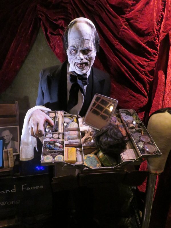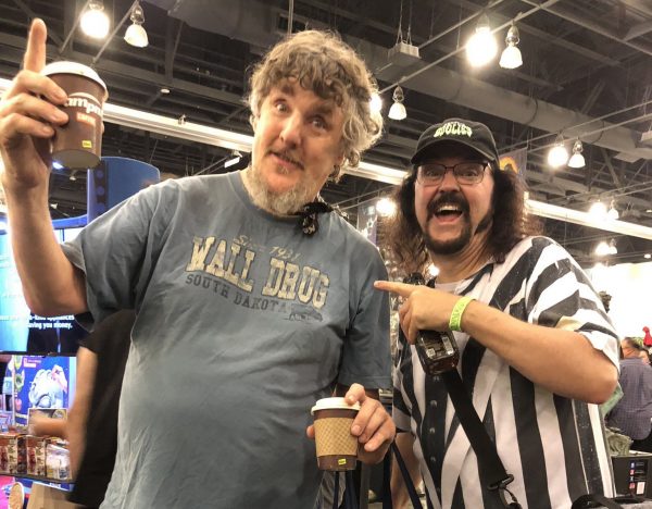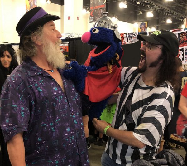 Saturday the 3rd – MONSTERPALOOZA: DAY 2! – My convention guest for the day was my pal Drew Massey, a top-notch Voice Over guy and master puppeteer. I wanted him to enjoy Monsterpalooza since he had never gone before. I told him I was taking my Super Grover, so he offered to bring an original puppet from the “Angel” TV show to play along. When he arrived we just walked around the show for a bit so he could experience the vibe, and he ended up knowing quite a few people there. It’s funny how the horror/monster crowd and the puppet crowd have so many commonalities. Then I said, “Let’s go get the boys.” We went back to home base and picked up the puppets. He did a few last-minute alterations to the Angel puppet with some well-placed safety pins and we were off and running. The fans loved them! Two completely different puppets, but both monsters, in their own right. It was fun watching a real puppeteer at work, and we had a great time posing for photos and making little videos on the convention floor for fans. But even though I placed Super Grover’s helmet on his head perfectly when I set out, throughout the day it moved back on his head. I was having a difficult time keeping it centered on his noggin. I gotta figure something out to prevent that from happening. The movement of the puppet when he talked was the cause of the helmet displacement, even though it was securely tied tightly under his chin. After we had spent a few hours on the floor, we decided to head back to the hotel, stash the puppets in my room, and head to the hotel bar to get some lunch. Just as we finished lunch, and just as Drew was about ready to split, he got a text from a few good friends who said they had been at the convention and were in the neighborhood eating at the Yard House restaurant. We headed to the restaurant so we could say hi. What fun. Drew took off and I headed back to the room to shower up. All the activity during the day made me quite sweaty! Just before the After-Life Party started, my friend Amanda came over to hang out. We watched a little bit of the band play, and then we headed across the street to get some dinner at the Mexican restaurant. I was pretty beat, as I had enjoyed a very full day of activity. After dinner we headed back to the party to watch the finale, and then chatted with some friends out in the courtyard. I got a good chance to speak with Eliot Brodsky, the owner of Monsterpalooza. He’s a great guy and he’s really created quite a “monster” of an event. He’s the one who asked me to perform as Tony Clifton at last year’s convention. When I got back to the room I tried a few things with a safety pin and duct tape to get Super Grover’s helmet to stay on his head and not move back. But nothing was working so far.