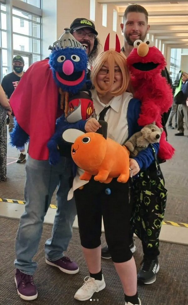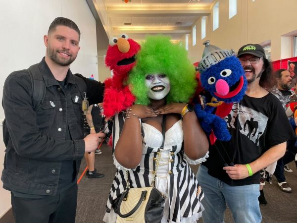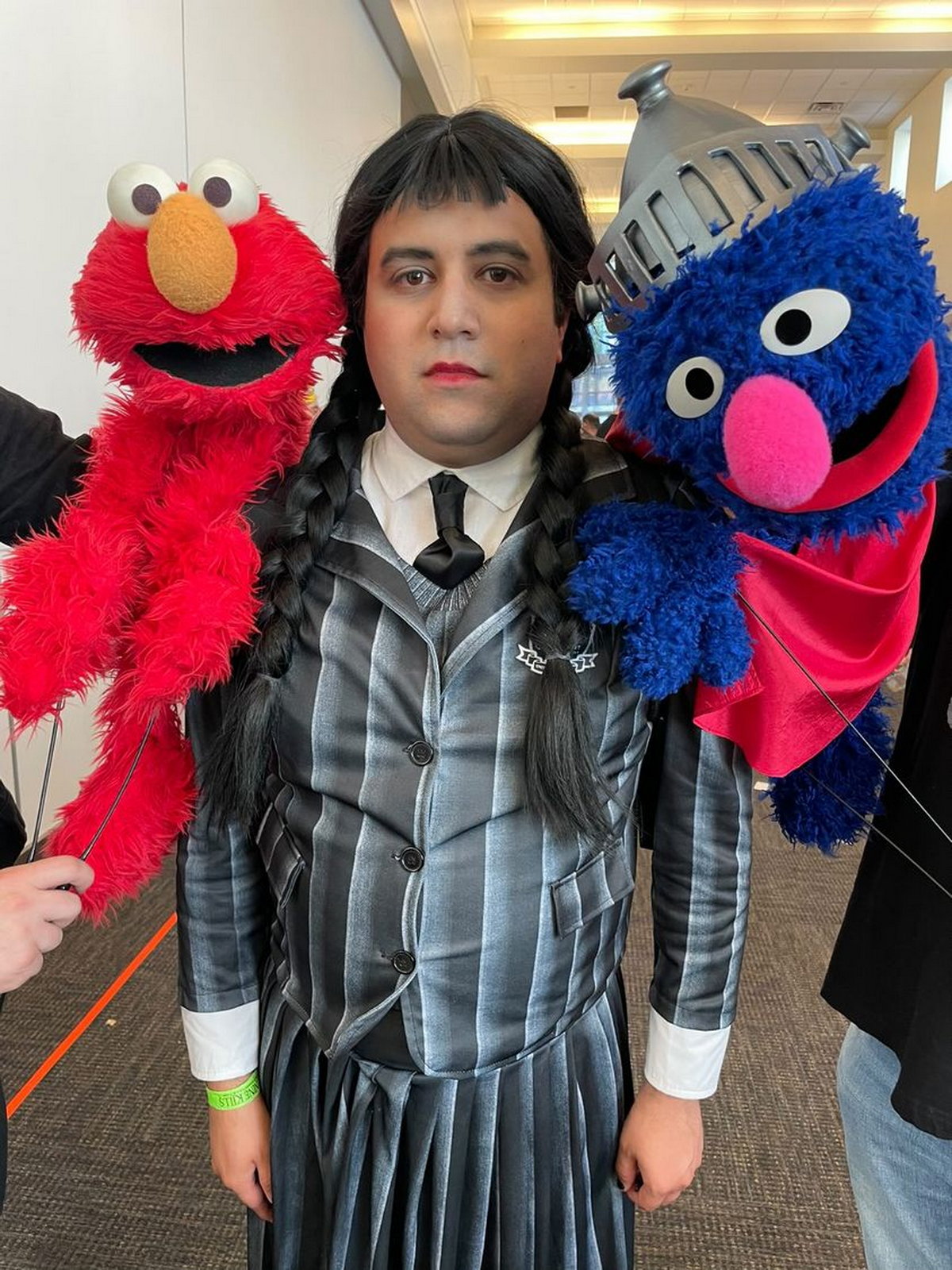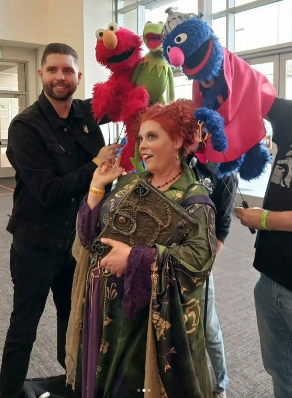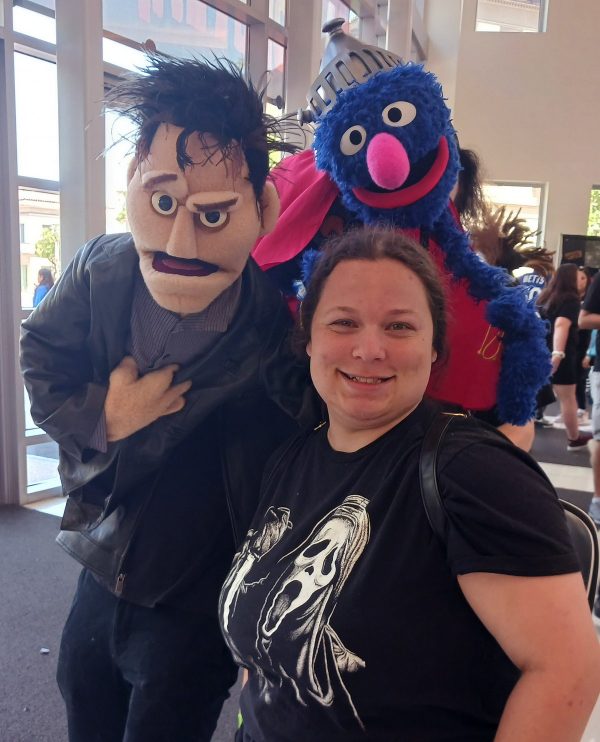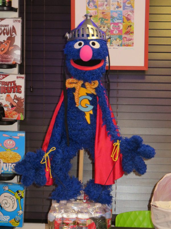Friday the 2nd – MONSTERPALOOZA: DAY 1! – When I got up early to head to Alex’s, after only a few hours of sleep, I saw a text from Alex asking me to come later, as the latex and paint on the redone helmet were still drying. But since I was already up I drove to Paty’s to enjoy an early lunch, and then went to Alex’s to pick up the updated helmet. It looked terrific. I drove home to pack some final things, and around 2pm I drove to Pasadena. By 3 I was at the hotel and ready to check into my room! This was truly the way to go. It would provide a “base of operations” for me all weekend, and would relieve me from having to drive back and forth to the convention each day, and best of all, I wouldn’t have to struggle to find parking every day! I even bought a second parking pass for my weekend guests who would be coming to the show as well! Sweet! Well worth the money! I took my luggage to my room and dropped everything off, and then went downstairs to meet my friend Angi who had also just arrived. Since it was now 4pm, and the show wasn’t going to open until 6, we had plenty of time to hang out, eat dinner in the hotel bar, and chat. At the appointed time we got in the long Will Call line (which wrapped around the block, but moved fast) and eventually got our wristbands. The convention, as always, is a bunch of fun! I saw lots of old friends and enjoyed great artists, vendors and exhibits. Angi was a bit overwhelmed, as she didn’t know what to expect at first, but she had a great time. She is, however, deathly afraid of evil clowns. For the most part she avoided any of the evil clown cosplayers on the convention floor, but at the very end one came very close to her. I told her to just ignore him and be cool and he wouldn’t come around. But as he got closer to us (he was coming in through a door through which we were exiting) she instinctively put her hands up to her eyes so she wouldn’t see him as we passed. That was all this cosplayer needed to see. He knew he had a victim! Then he started stalking around her and it was pretty funny. I told him, “I don’t think you want to do that.” I had told her earlier that Monsterpalooza wasn’t a “jump scare” kind of place, so she didn’t have anything to worry about. But the fact that she avoided an evil clown all evening, until the very end, was kind of amusing. I met a guy named Jeremy who had a replica Elmo puppet, and he could do the voice very well. I told him I’d have Grover on Saturday in case he wanted to come back to the show again tomorrow. He also did the best Mickey Mouse impression I think I’ve ever heard! The guy has a bright future if he can get the right representation. Robert England, Freddy from the “Nightmare on Elm Street” movies, was supposed to be the star attraction for the weekend. But unfortunately, just minutes before the show started, his Covid test came back positive. So he’s out for the weekend, much to the disappointment of thousands of fans who came to meet him. The show closed at 11 and I stayed until the very end. These are my peeps! Everyone is so nice and wonderful, and monster fans are some of the most kind and creative people I know. I was talking to Angi about why people who are into horror movies are so nice, which seems strange. We determined that these people were probably the “nerds” in school when they were young (myself included) and probably took a lot of chastisement and ridicule for their love of the genre. So now they know better than to pass it on, and enjoy being with other fans of like mind. I told her that the real jerks are sports fans, who will stab you if you wear the wrong team jersey. Most likely, the jocko sports fans were always idiots, and when you add alcohol to the mix their stupidity gets amplified exponentially. Nope. Give me monster fans EVERY time! I went back to my room to unpack and dress Super Grover for some Saturday fun.