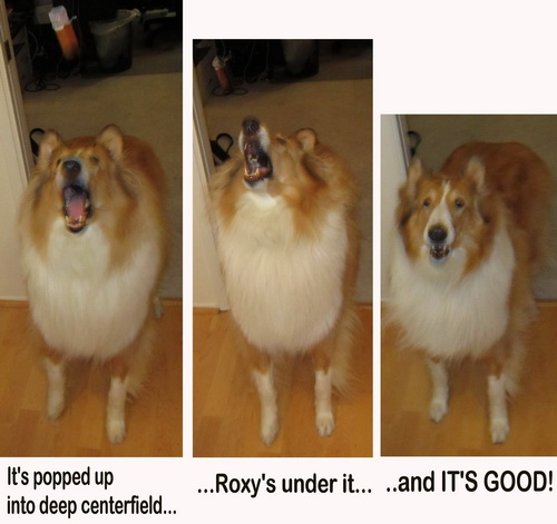 On her 5th birthday, here’s Roxy in frame-by-frame doggie action catching pieces of her birthday steak.
