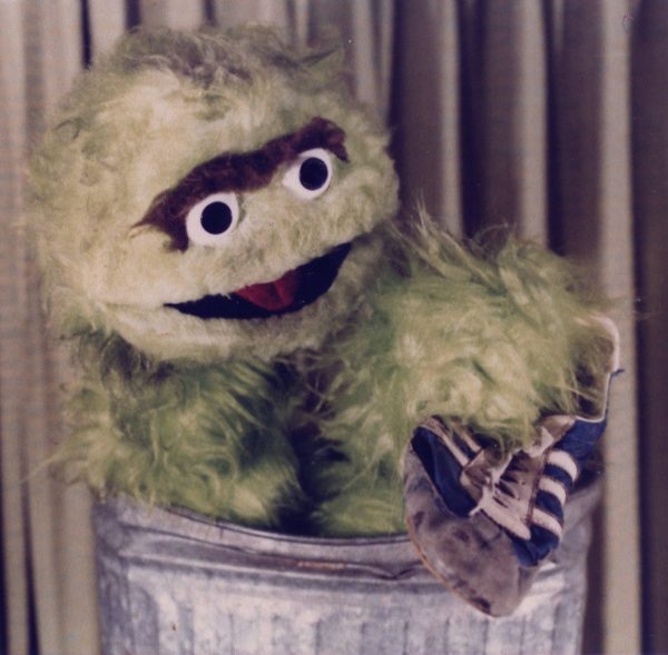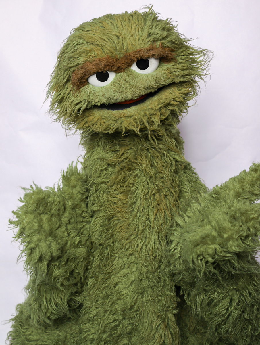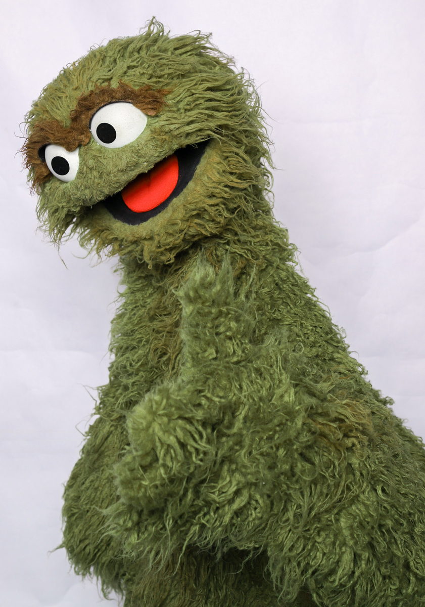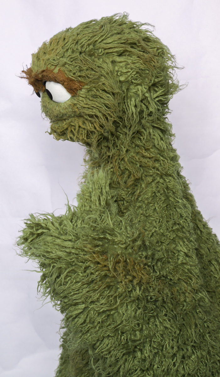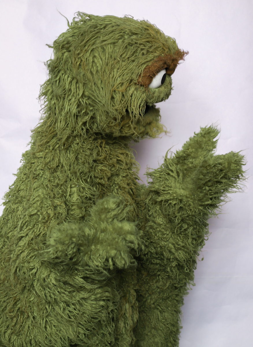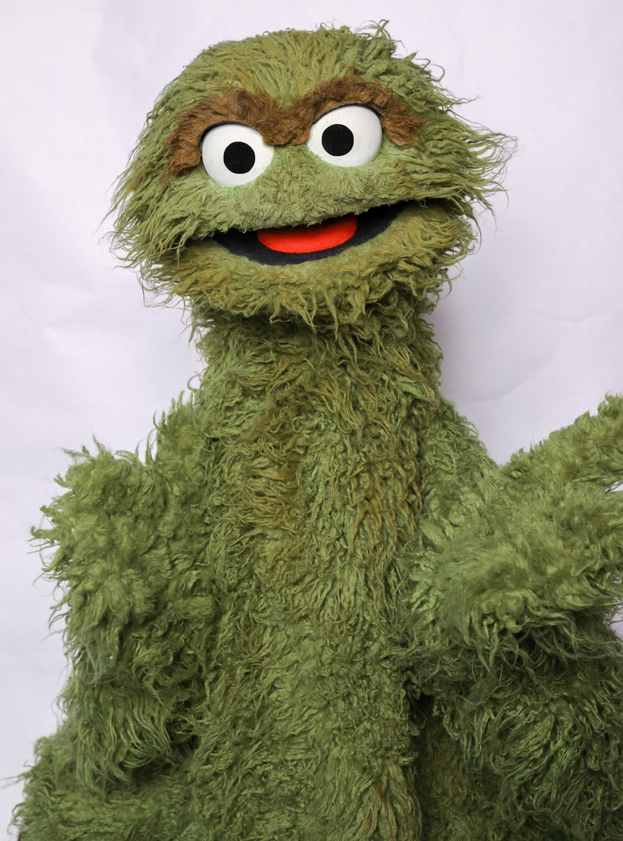 Notes: A center ring between the eyeballs inside the puppet’s head allows the puppeteer’s middle finger to manipulate the eyebrow with simple “counterbalance.” When the middle finger is down Oscar is wide-eyed. When the middle finger goes up, Oscar frowns. This is why Carroll Spinner was once quoted as saying, “When Oscar frowned, I was flipping off the world.”