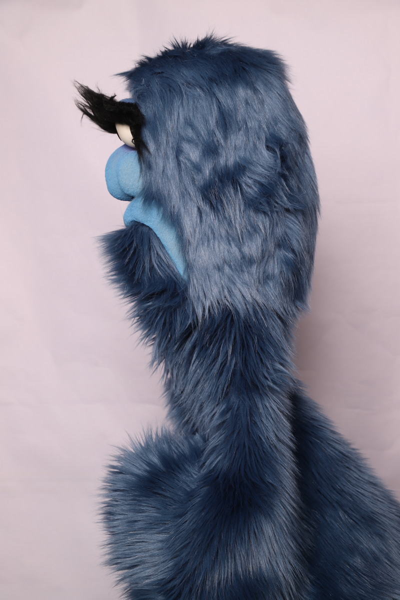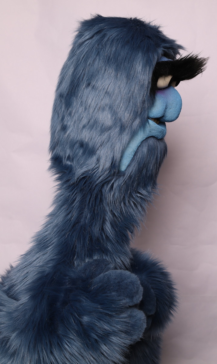 Notes: The frown mechanism is operated by a center ring between the eyes inside the puppet’s head. Because the mouth plate is vertical (unlike the standard horizontal mouth plates) the spring-loaded frown mechanism has to be pulled downwards with the middle finger.