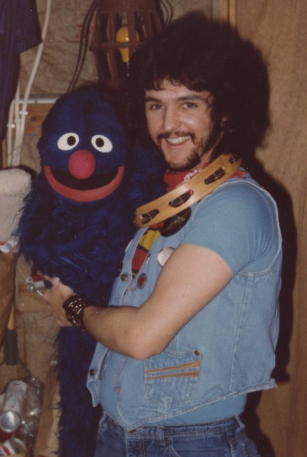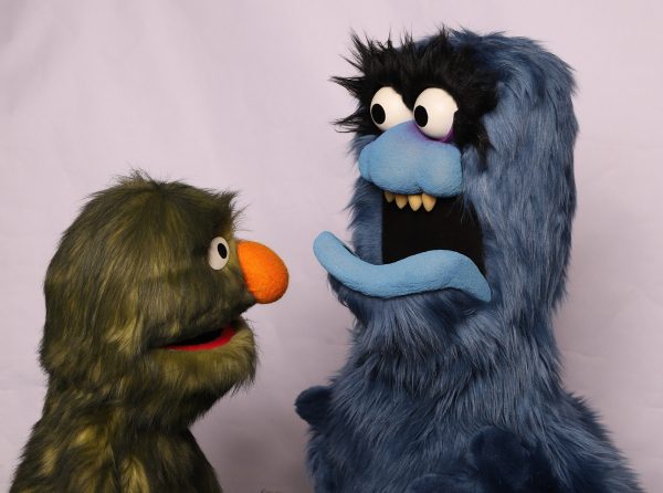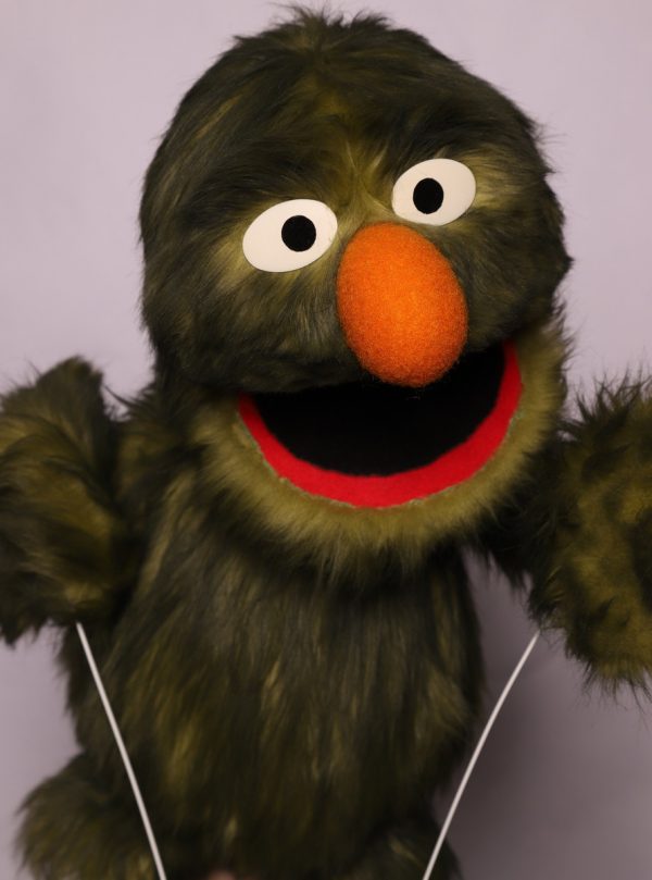 In order to add a nostalgic, retro element to this puppet, the red fleece in the mouth, the orange fleece on his nose, and the plastic eye pieces are all vintage materials from the 1970’s. These elements were all leftover materials from my teenage puppet-building days.