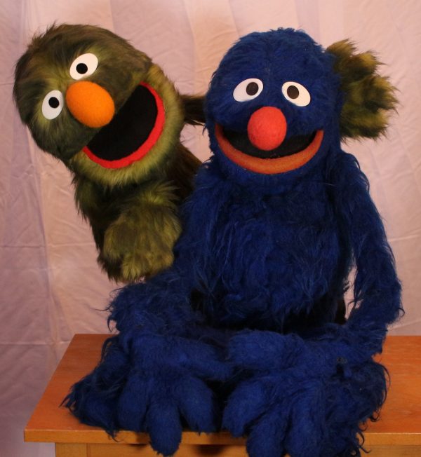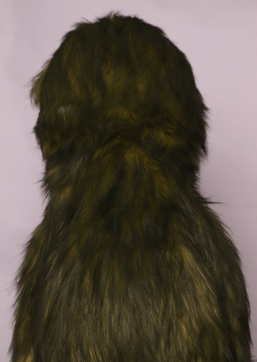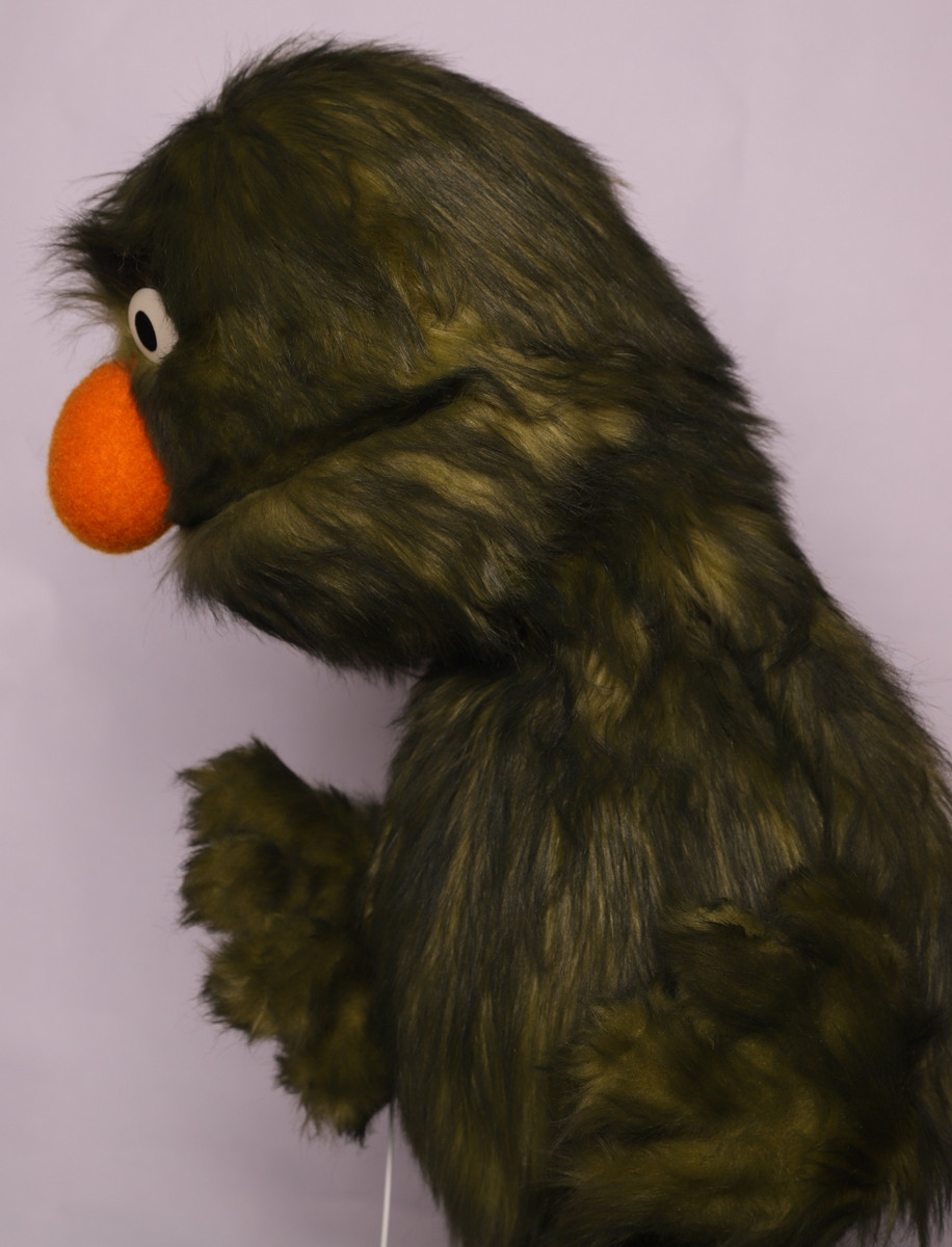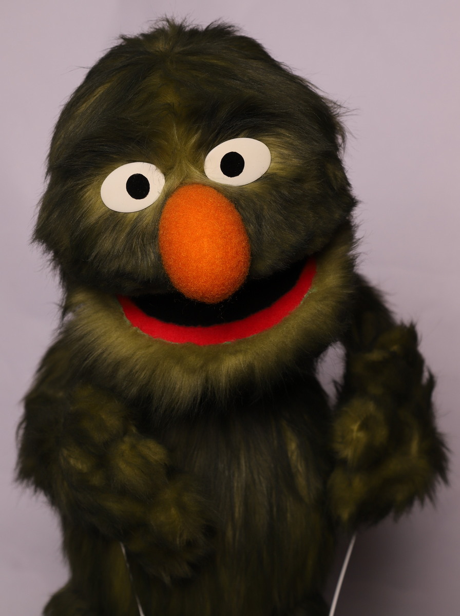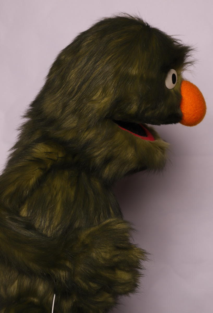 The two-tone green/black fur was created by Alex McGee at Alex In Wonderland. The puppet was constructed out of lime green fur, and then over-sprayed with dark green ink with an airbrush.
