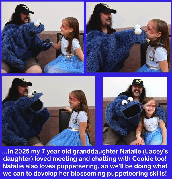 At the time of his creation I was in touch with the family of a young 3 year old boy named Carlos who loved “Sesame Street” (particularly Cookie Monster) but was dealing with a very aggressive form of cancer. It was my intention to use my Cookie Monster in various Zoom calls with Carlos to help take his mind off his grueling cancer treatments.