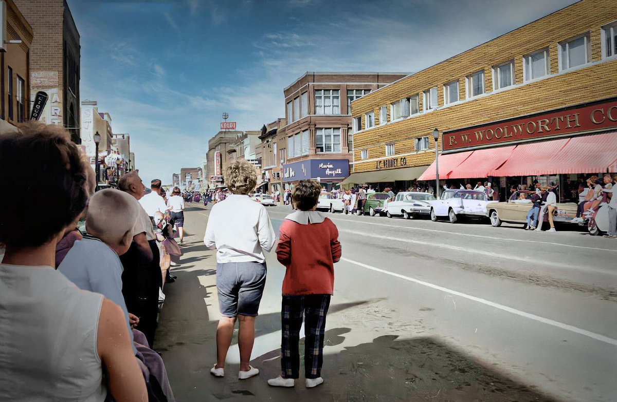 I like to lurk on a Facebook page dedicated to nostalgic recollections from Aberdeen, South Dakota – where I spent 9 formative years in my life. This restored photo really took me back, as it shows a pristine Main Street looking exactly the way I remember it as a kid! Those were good times!