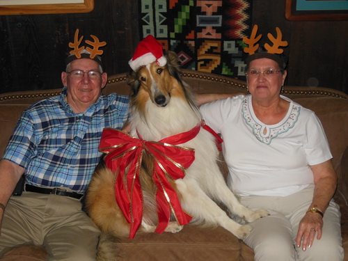 When I took my folks out to Lassieland to meet all of Roxy’s relatives, they posed with Lassie 10 (my dog Roxy’s brother Junior!). The photo was so great I suggested that they use it for their Christmas card for this season. Immediately Lassie’s trainer Carol Riggins brought out the decorations and magic was made!