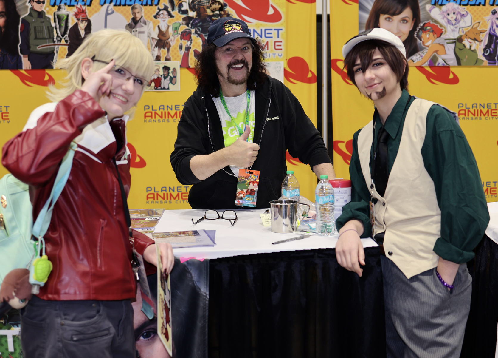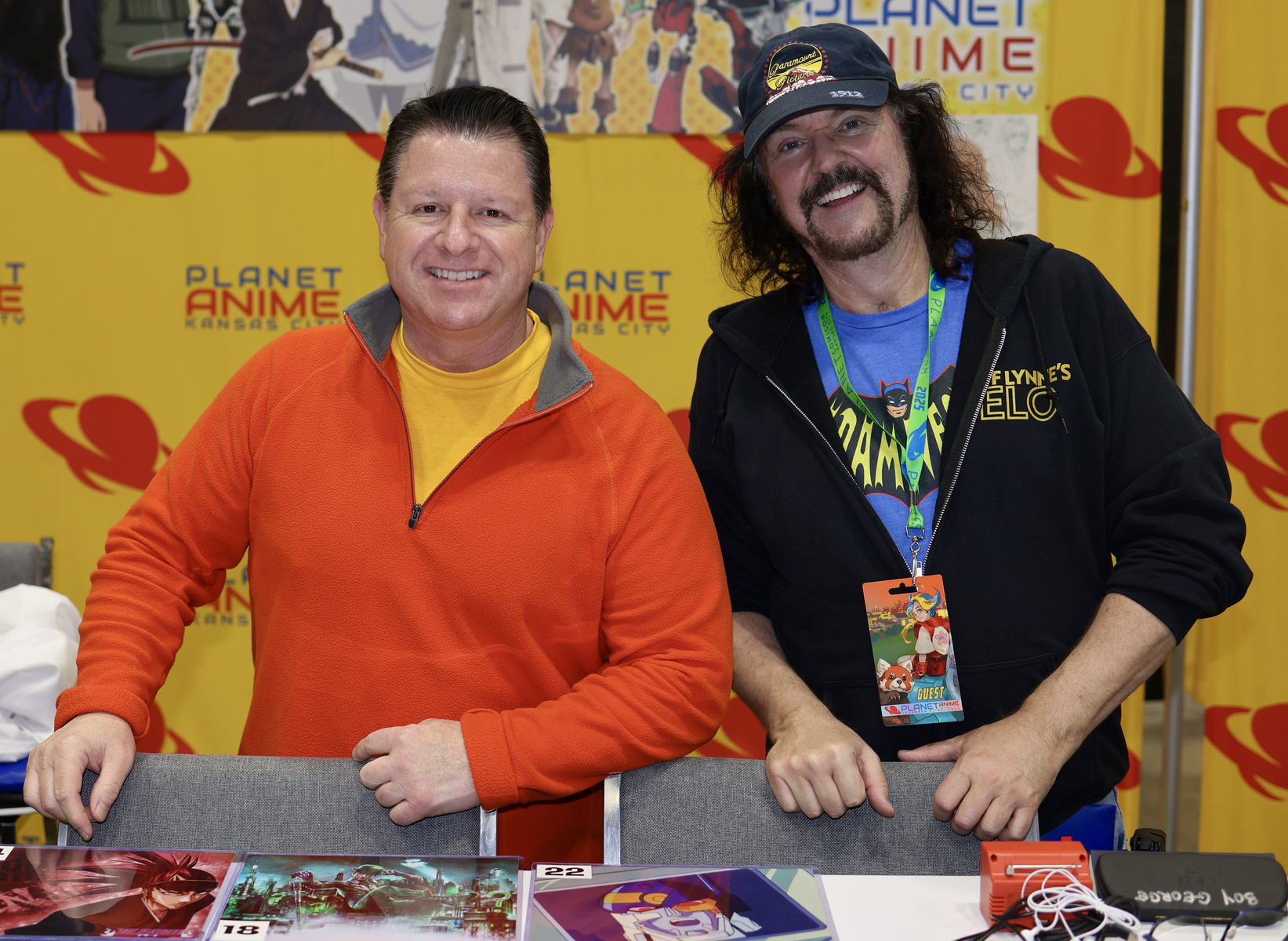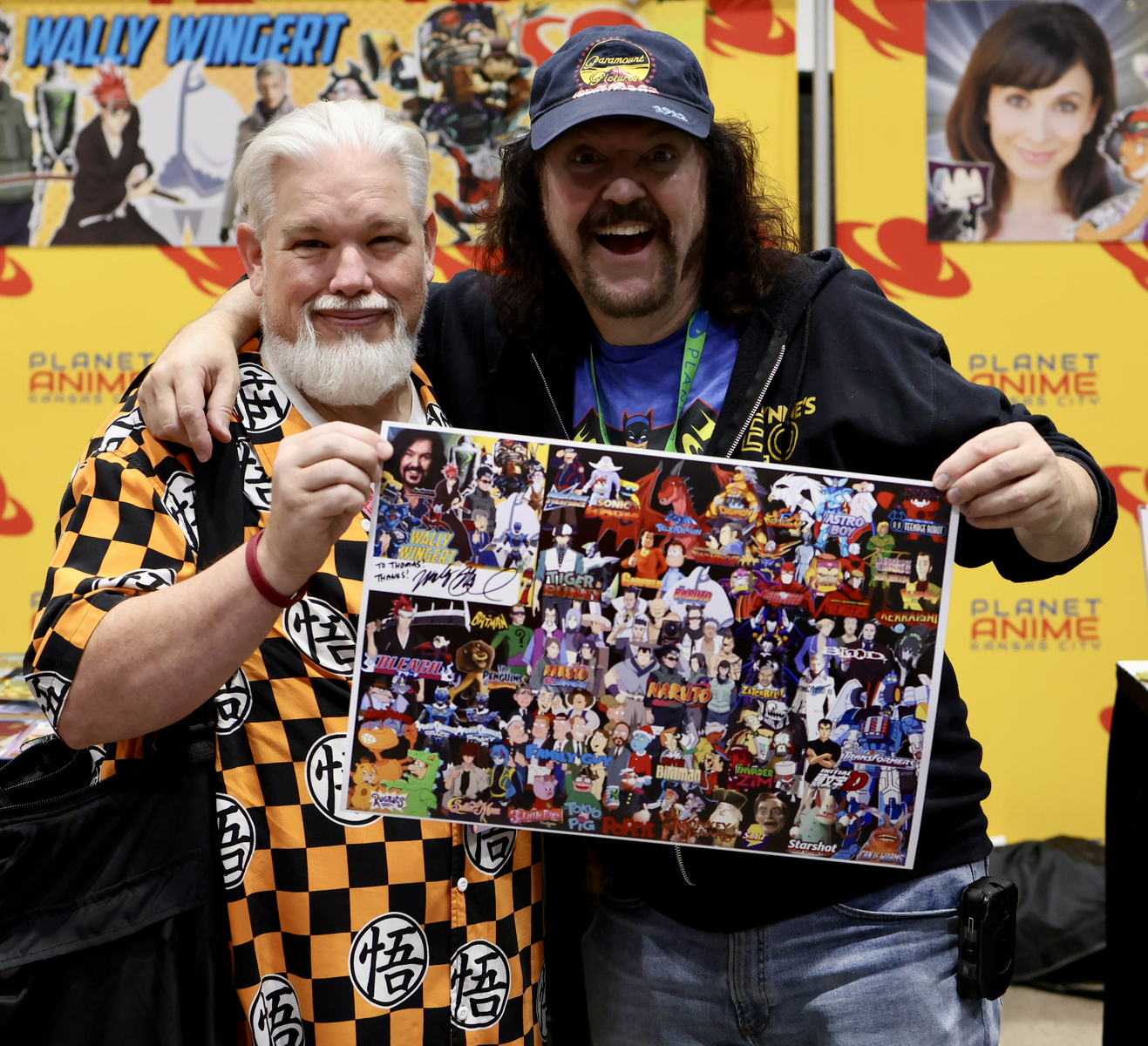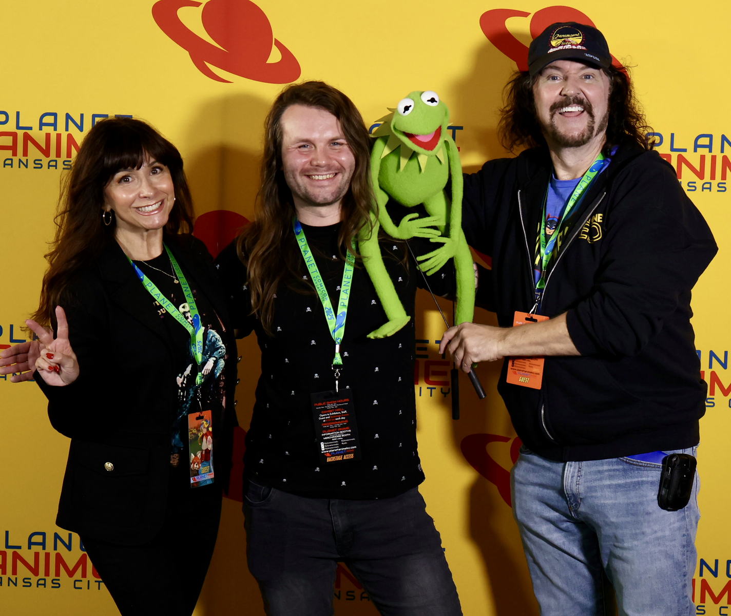 Saturday the 22nd – PLANET ANIME KANSAS CITY: DAY 1! – Just after 10am Mark arrived at my hotel lobby and we were walked over to the convention. Luckily, Mark was given an all-access pass so he could shoot photos at will whenever and wherever he wanted. I was introduced to Lance, who would be my assistant for the weekend. I named him Lancelot because he was so gallant and effective. As is common in the Midwest, the people were very, very nice. I had a great time meeting everyone. Just before noon we were walked over to the panel stage for the “Invader Zim” panel, and I was soon joined by my “Zim” cast mate Melissa Fahn. Though there were only two of us we would make sure the Zim fans in the audience had a great time. Just before the show I decided to take a potty break in the backstage bathroom. When I came out one of the locals said, “Did you like the urinals with no partition between them?” I said, “What?” I went back in and sure enough, the partition between urinal 4 and urinal 5 was gone. I got a funny idea. When going to these conventions it’s my habit to try and do something so outrageous and funny that it’s talked about years later. At one convention I had pizza delivered by Domino’s during the panel. I had some pieces leftover, as very few of my panel mates wanted to partake, so I had audience members come up to the stage and grab pieces of pizza. The moderator was a guy named Zach Wilson, and Zack and I had spoken via Zoom many years ago for an on-line interview. I asked Mark to grab his camera, and I asked Zack to join. The picture we took speaks for itself, but I like to call it “Peeing With Partners.” Everyone got a great laugh out of it, and the word spread quickly. (I know what you’re going to ask, and the answer is no.) I’m sure many KC con-goers will be talking about “Peeing With Partners” for a long time to come. After the panel it was time for lunch, and the con had catered in delicious Kansas City barbecue from a well-known restaurant called Q39. It was fantastic! As I got back to the convention floor, I saw that my friends Steve and Winnie Van Dyke had arrived. I gave them both a big hug and invited them to stay and watch while I did some signing, and posed for some photos. They stayed around for a little while, but since it was their first “con” experience, they wanted to go looking around. They ended up having a GREAT time, and even bought a few things! During a break, I took Kermit out on the floor for a while to have some fun. Kermit had some fun with May Hong of “K-Pop Demon Hunters” fame. My granddaughter Natalie is nuts about that movie, so I’m going to get an autograph and video shout-out for her on Sunday morning. But her line is always so long! I got a signed pin-up and video shout-out from Gabe Kundun, who plays King on “One Piece.” My grandson Elliot had requested it. Mark continued to take a ton of pics and video, I got great gifts from a lot of fans, and it was great to see so many “Tiger and Bunny” cosplayers! I’m hoping that means that the show (which I truly adore) is getting more fanlove! As I spoke with a few female “T&B” fans, they explained to me that most of the female fans are into the heroes’ secret identities; Kotetsu and Barnaby. They like Kotetsu particularly, because they feel he’s a good guy and he’s funny. That would explain why I sign mostly Kotetsu stuff for the ladies, and the guys like to have Wild Tiger stuff signed. It totally made sense! I also met two sisters named Rachel and Jordan who had driven 3 hours to meet me and my “Bleach” cast mate Dan Woren. Unfortunately Dan had to cancel at the last minute for a medical reason. So I spent some time chatting with them and admiring their Soul Reaper costumes. I loved all the nice people I met from the area. Really top quality people! The convention ended for the day so I headed back to my room to freshen up. The guy at the front desk suggested Mark and I hit a place called Grinders for casual sandwiches and pizza. But when Mark booked an Uber to take us there, he took us to an empty building. Apparently Uber’s mapping system hadn’t updated to the new address. And also, it seemed like there were several Grinders to choose from. There was a restaurant, and there was a bar – both with the same name. We found an alternate address and when we arrived it was pretty unspectacular. The bar was to the left, and the dingy little restaurant was to the right. We walked in and the atmosphere seemed sub-casual, but we stayed anyway – keeping in mind the hotel desk clerk’s recommendation, and the fact that he said that Guy Fieri had given them some sort of recommendation for their Philly Cheesesteak sandwich. The music was extra loud, and extra annoying – bordering on torturous. I didn’t recognize one song, and it all seemed angry and abrasive. We put our order in (me a pizza, and Mark was going to try the “award-winning” Philly Cheesesteak sandwich), but the waitress didn’t write down the order. In fact, when she repeated it back to us she got it wrong. Uh oh. After about a half hour, we still hadn’t gotten our order. But yet people who had come in after us were getting their orders. Something was up. Either the waitress forgot to submit our order, or something else was awry. After about 50 minutes I got up and asked a guy who seemed to be the manager if things were getting close to being served. He said, “Well, ya know, it takes about 25 minutes for a pizza to be finished.” I told him we had been there 50 minutes already, and could we just get our food to go. The abrasive, annoying music was getting to us and starting to ruin our day. If the restaurant thought they were being hip and edgy with their horrible choice (and ear-bleeding level) of music, they were sadly mistaken. It was more likely they wanted to close and were hoping to drive everyone out. If so, it was working. We finally got our order and