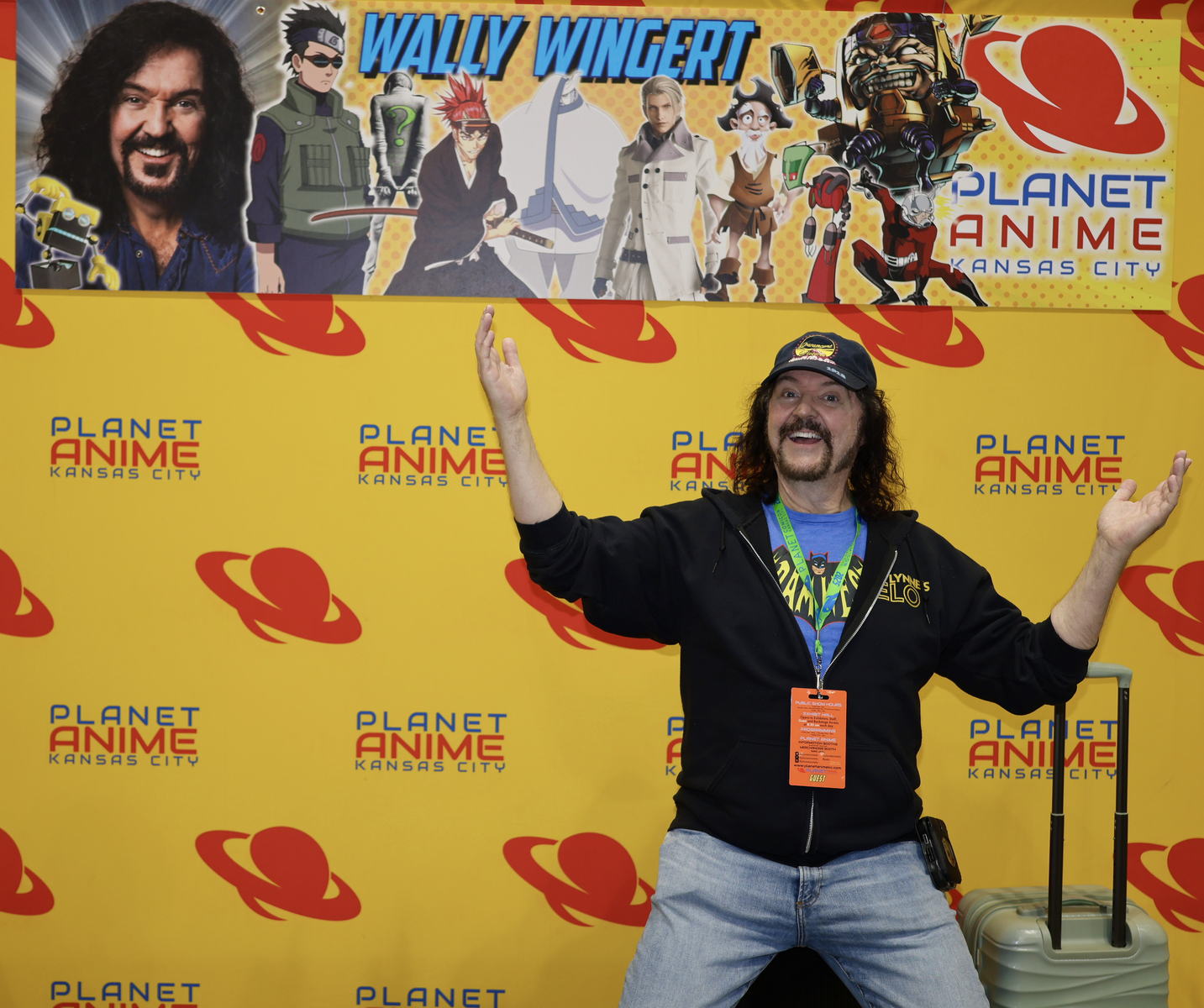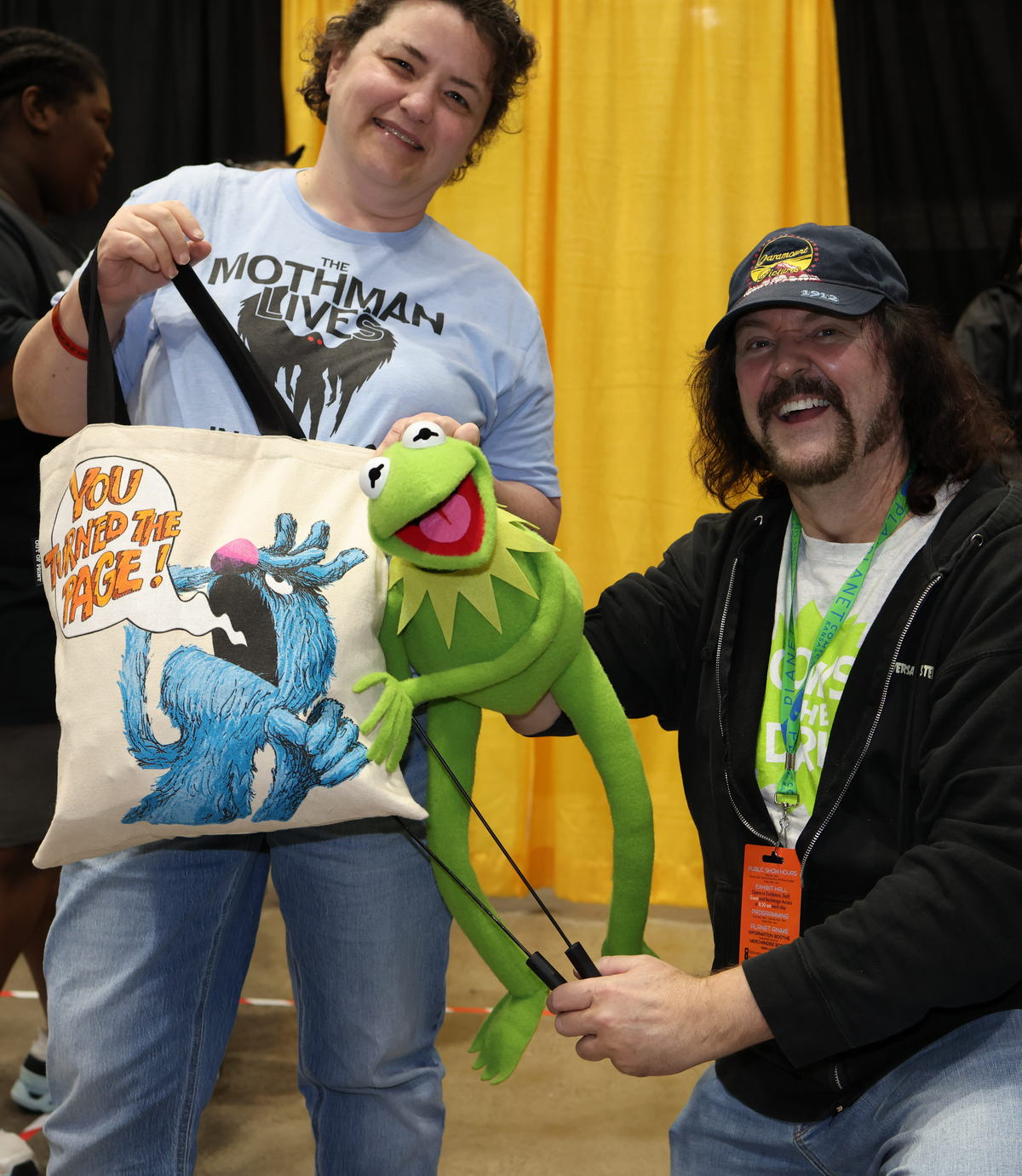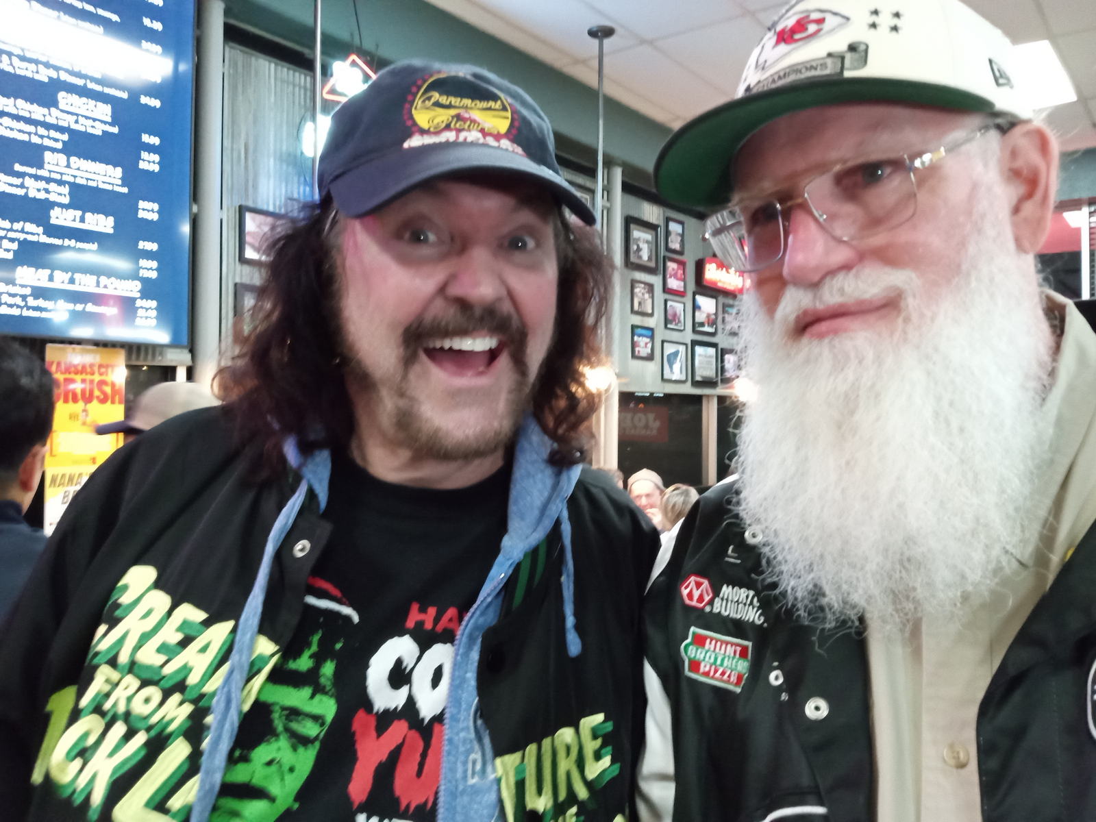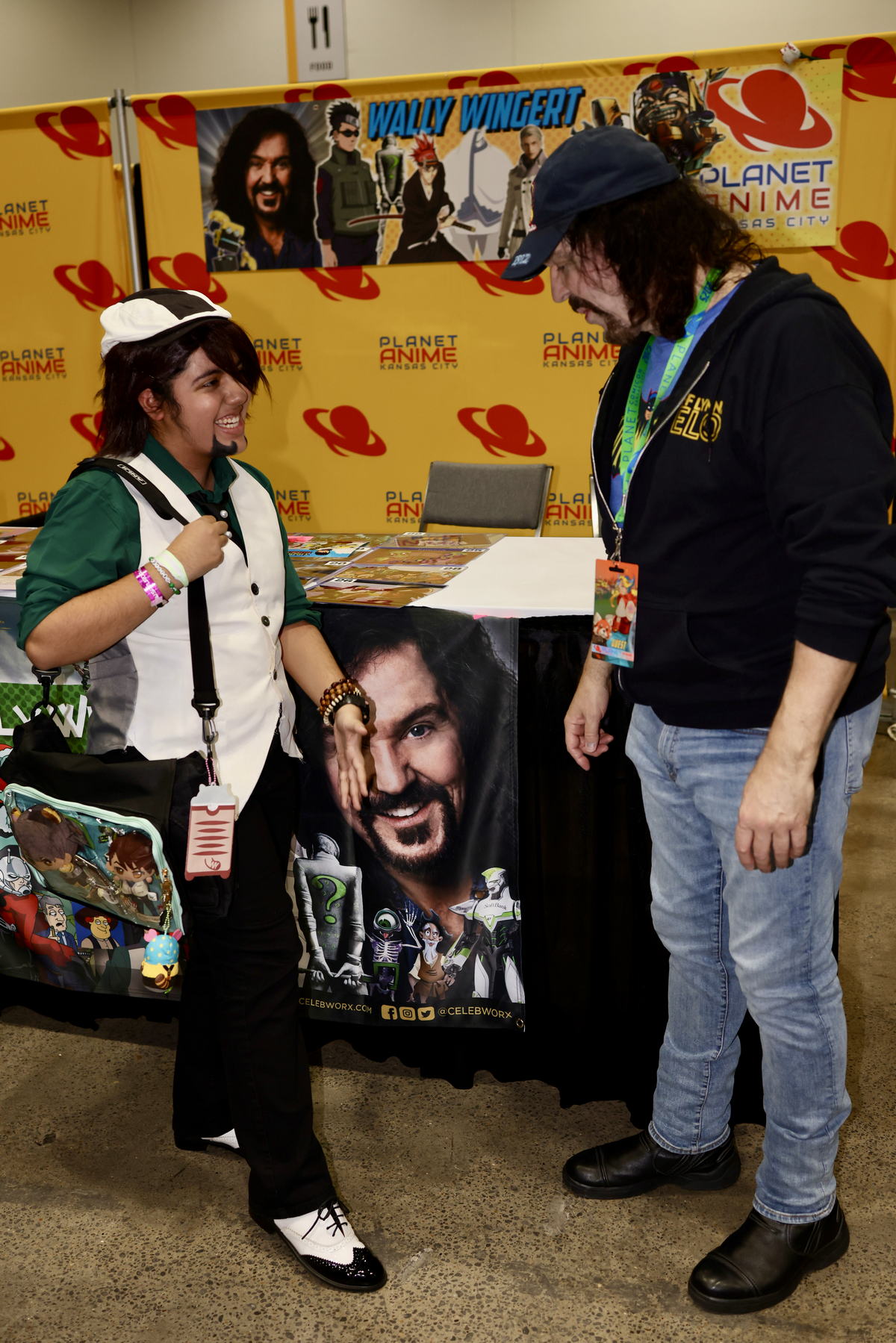 Saturday the 22nd – PLANET ANIME KANSAS CITY: DAY 1! – Just after 10am Mark arrived at my hotel lobby and we were walked over to the convention. Luckily, Mark was given an all-access pass so he could shoot photos at will whenever and wherever he wanted. I was introduced to Lance, who would be my assistant for the weekend. I named him Lancelot because he was so gallant and effective. As is common in the Midwest, the people were very, very nice. I had a great time meeting everyone. Just before noon we were walked over to the panel stage for the “Invader Zim” panel, and I was soon joined by my “Zim” cast mate Melissa Fahn. Though there were only two of us we would make sure the Zim fans in the audience had a great time. Just before the show I decided to take a potty break in the backstage bathroom. When I came out one of the locals said, “Did you like the urinals with no partition between them?” I said, “What?” I went back in and sure enough, the partition between urinal 4 and urinal 5 was gone. I got a funny idea. When going to these conventions it’s my habit to try and do something so outrageous and funny that it’s talked about years later. At one convention I had pizza delivered by Domino’s during the panel. I had some pieces leftover, as very few of my panel mates wanted to partake, so I had audience members come up to the stage and grab pieces of pizza. The moderator was a guy named Zach Wilson, and Zack and I had spoken via Zoom many years ago for an on-line interview. I asked Mark to grab his camera, and I asked Zack to join. The picture we took speaks for itself, but I like to call it “Peeing With Partners.” Everyone got a great laugh out of it, and the word spread quickly. (I know what you’re going to ask, and the answer is no.) I’m sure many KC con-goers will be talking about “Peeing With Partners” for a long time to come. After the panel it was time for lunch, and the con had catered in delicious Kansas City barbecue from a well-known restaurant called Q39. It was fantastic! As I got back to the convention floor, I saw that my friends Steve and Winnie Van Dyke had arrived. I gave them both a big hug and invited them to stay and watch while I did some signing, and posed for some photos. They stayed around for a little while, but since it was their first “con” experience, they wanted to go looking around. They ended up having a GREAT time, and even bought a few things! During a break, I took Kermit out on the floor for a while to have some fun. Kermit had some fun with May Hong of “K-Pop Demon Hunters” fame. My granddaughter Natalie is nuts about that movie, so I’m going to get an autograph and video shout-out for her on Sunday morning. But her line is always so long! I got a signed pin-up and video shout-out from Gabe Kundun, who plays King on “One Piece.” My grandson Elliot had requested it. Mark continued to take a ton of pics and video, I got great gifts from a lot of fans, and it was great to see so many “Tiger and Bunny” cosplayers! I’m hoping that means that the show (which I truly adore) is getting more fanlove! As I spoke with a few female “T&B” fans, they explained to me that most of the female fans are into the heroes’ secret identities; Kotetsu and Barnaby. They like Kotetsu particularly, because they feel he’s a good guy and he’s funny. That would explain why I sign mostly Kotetsu stuff for the ladies, and the guys like to have Wild Tiger stuff signed. It totally made sense! I also met two sisters named Rachel and Jordan who had driven 3 hours to meet me and my “Bleach” cast mate Dan Woren. Unfortunately Dan had to cancel at the last minute for a medical reason. So I spent some time chatting with them and admiring their Soul Reaper costumes. I loved all the nice people I met from the area. Really top quality people! The convention ended for the day so I headed back to my room to freshen up. The guy at the front desk suggested Mark and I hit a place called Grinders for casual sandwiches and pizza. But when Mark booked an Uber to take us there, he took us to an empty building. Apparently Uber’s mapping system hadn’t updated to the new address. And also, it seemed like there were several Grinders to choose from. There was a restaurant, and there was a bar – both with the same name. We found an alternate address and when we arrived it was pretty unspectacular. The bar was to the left, and the dingy little restaurant was to the right. We walked in and the atmosphere seemed sub-casual, but we stayed anyway – keeping in mind the hotel desk clerk’s recommendation, and the fact that he said that Guy Fieri had given them some sort of recommendation for their Philly Cheesesteak sandwich. The music was extra loud, and extra annoying – bordering on torturous. I didn’t recognize one song, and it all seemed angry and abrasive. We put our order in (me a pizza, and Mark was going to try the “award-winning” Philly Cheesesteak sandwich), but the waitress didn’t write down the order. In fact, when she repeated it back to us she got it wrong. Uh oh. After about a half hour, we still hadn’t gotten our order. But yet people who had come in after us were getting their orders. Something was up. Either the waitress forgot to submit our order, or something else was awry. After about 50 minutes I got up and asked a guy who seemed to be the manager if things were getting close to being served. He said, “Well, ya know, it takes about 25 minutes for a pizza to be finished.” I told him we had been there 50 minutes already, and could we just get our food to go. The abrasive, annoying music was getting to us and starting to ruin our day. If the restaurant thought they were being hip and edgy with their horrible choice (and ear-bleeding level) of music, they were sadly mistaken. It was more likely they wanted to close and were hoping to drive everyone out. If so, it was working. We finally got our order and