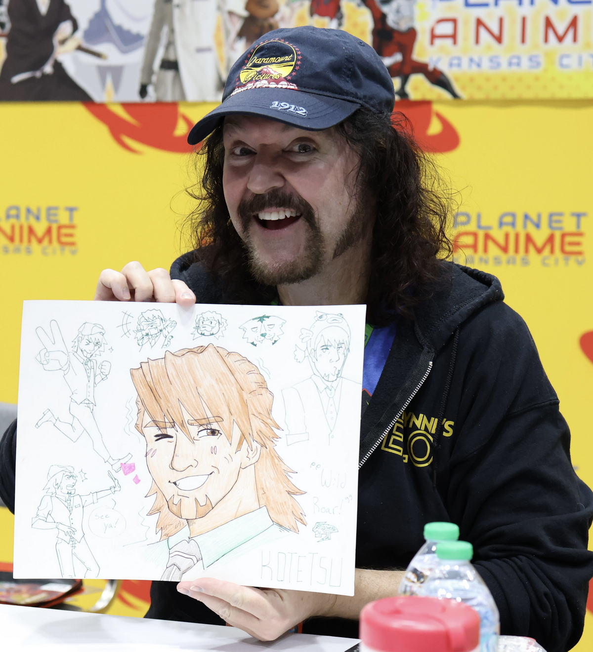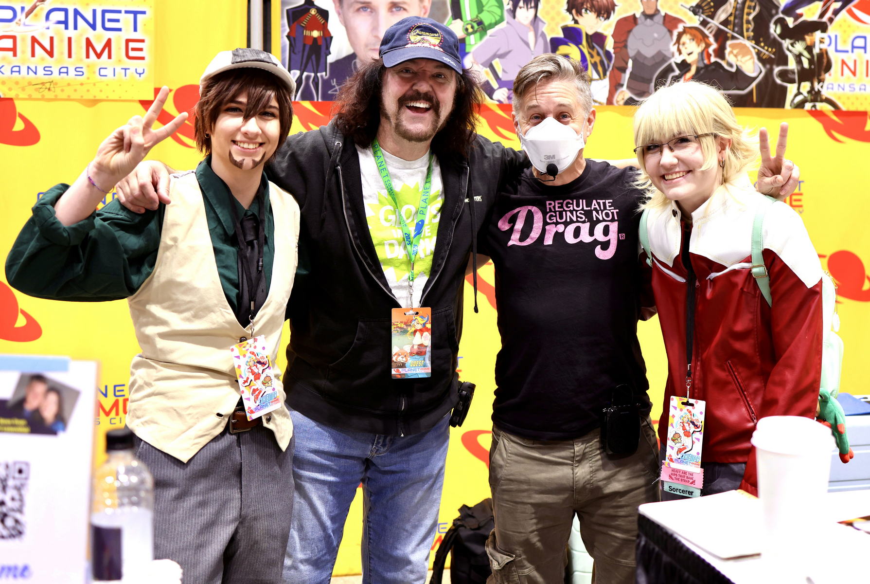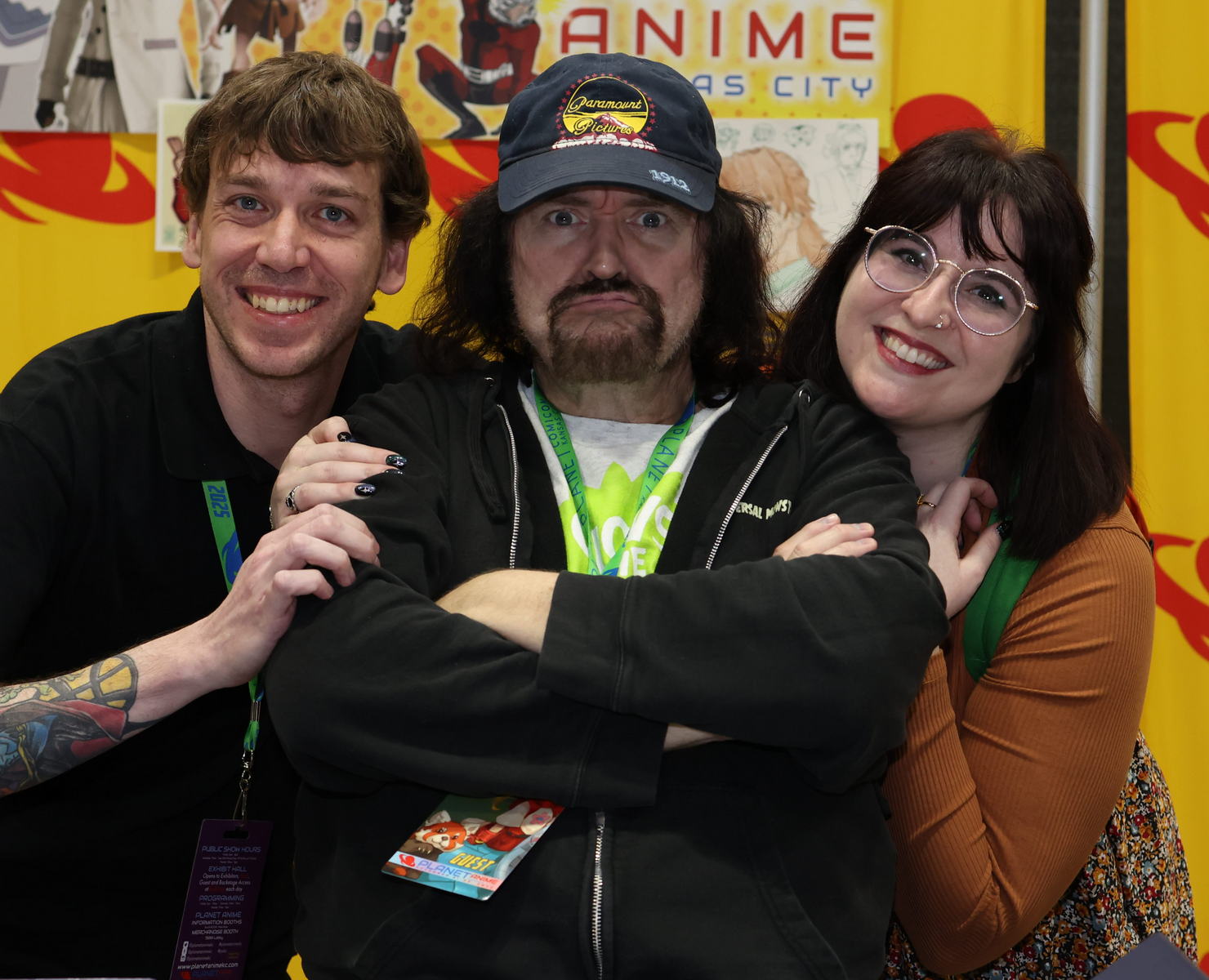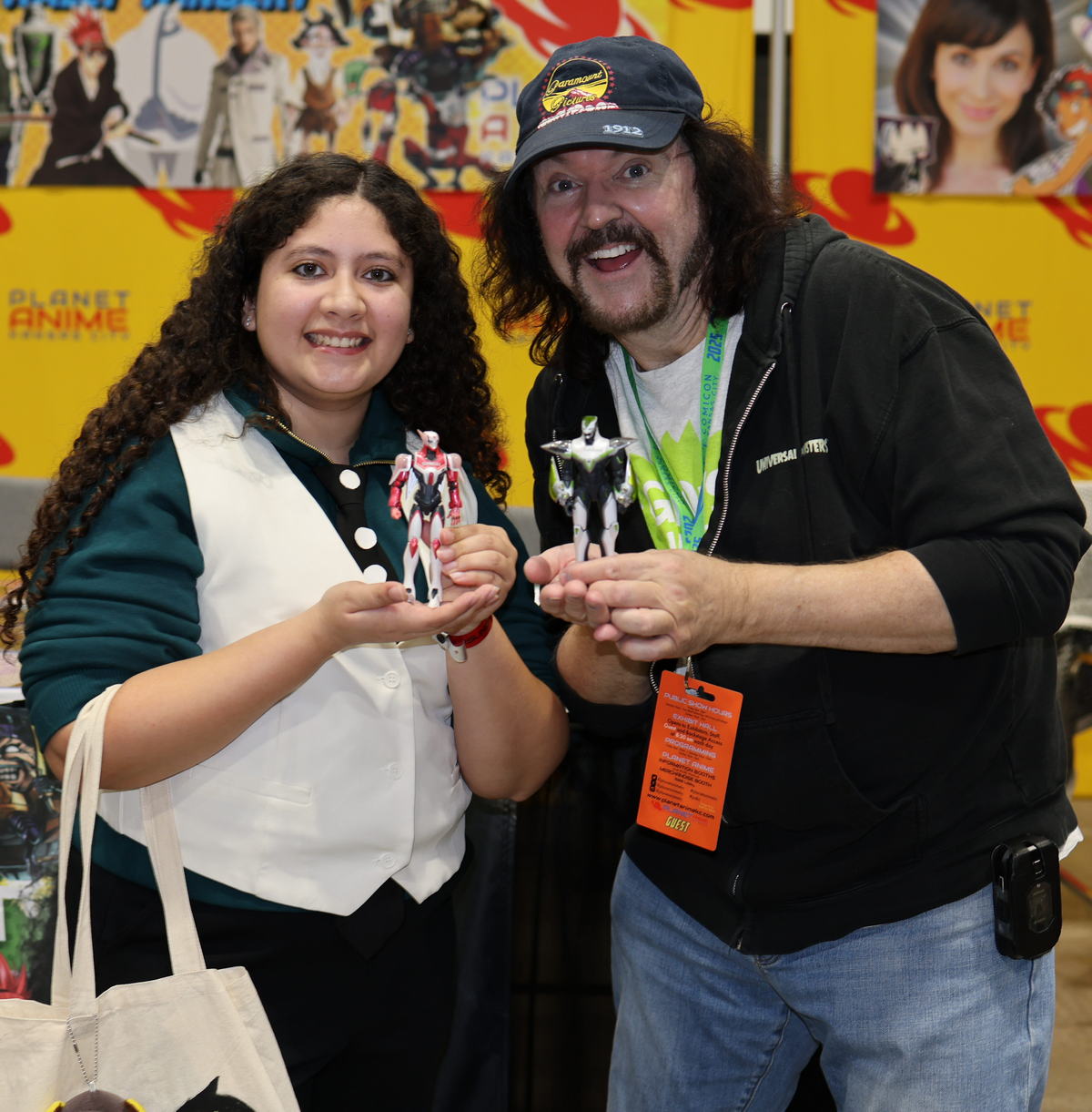 Saturday the 22nd – PLANET ANIME KANSAS CITY: DAY 1! – Just after 10am Mark arrived at my hotel lobby and we were walked over to the convention. Luckily, Mark was given an all-access pass so he could shoot photos at will whenever and wherever he wanted. I was introduced to Lance, who would be my assistant for the weekend. I named him Lancelot because he was so gallant and effective. As is common in the Midwest, the people were very, very nice. I had a great time meeting everyone. Just before noon we were walked over to the panel stage for the “Invader Zim” panel, and I was soon joined by my “Zim” cast mate Melissa Fahn. Though there were only two of us we would make sure the Zim fans in the audience had a great time. Just before the show I decided to take a potty break in the backstage bathroom. When I came out one of the locals said, “Did you like the urinals with no partition between them?” I said, “What?” I went back in and sure enough, the partition between urinal 4 and urinal 5 was gone. I got a funny idea. When going to these conventions it’s my habit to try and do something so outrageous and funny that it’s talked about years later. At one convention I had pizza delivered by Domino’s during the panel. I had some pieces leftover, as very few of my panel mates wanted to partake, so I had audience members come up to the stage and grab pieces of pizza. The moderator was a guy named Zach Wilson, and Zack and I had spoken via Zoom many years ago for an on-line interview. I asked Mark to grab his camera, and I asked Zack to join. The picture we took speaks for itself, but I like to call it “Peeing With Partners.” Everyone got a great laugh out of it, and the word spread quickly. (I know what you’re going to ask, and the answer is no.) I’m sure many KC con-goers will be talking about “Peeing With Partners” for a long time to come. After the panel it was time for lunch, and the con had catered in delicious Kansas City barbecue from a well-known restaurant called Q39. It was fantastic! As I got back to the convention floor, I saw that my friends Steve and Winnie Van Dyke had arrived. I gave them both a big hug and invited them to stay and watch while I did some signing, and posed for some photos. They stayed around for a little while, but since it was their first “con” experience, they wanted to go looking around. They ended up having a GREAT time, and even bought a few things! During a break, I took Kermit out on the floor for a while to have some fun. Kermit had some fun with May Hong of “K-Pop Demon Hunters” fame. My granddaughter Natalie is nuts about that movie, so I’m going to get an autograph and video shout-out for her on Sunday morning. But her line is always so long! I got a signed pin-up and video shout-out from Gabe Kundun, who plays King on “One Piece.” My grandson Elliot had requested it. Mark continued to take a ton of pics and video, I got great gifts from a lot of fans, and it was great to see so many “Tiger and Bunny” cosplayers! I’m hoping that means that the show (which I truly adore) is getting more fanlove! As I spoke with a few female “T&B” fans, they explained to me that most of the female fans are into the heroes’ secret identities; Kotetsu and Barnaby. They like Kotetsu particularly, because they feel he’s a good guy and he’s funny. That would explain why I sign mostly Kotetsu stuff for the ladies, and the guys like to have Wild Tiger stuff signed. It totally made sense! I also met two sisters named Rachel and Jordan who had driven 3 hours to meet me and my “Bleach” cast mate Dan Woren. Unfortunately Dan had to cancel at the last minute for a medical reason. So I spent some time chatting with them and admiring their Soul Reaper costumes. I loved all the nice people I met from the area. Really top quality people! The convention ended for the day so I headed back to my room to freshen up. The guy at the front desk suggested Mark and I hit a place called Grinders for casual sandwiches and pizza. But when Mark booked an Uber to take us there, he took us to an empty building. Apparently Uber’s mapping system hadn’t updated to the new address. And also, it seemed like there were several Grinders to choose from. There was a restaurant, and there was a bar – both with the same name. We found an alternate address and when we arrived it was pretty unspectacular. The bar was to the left, and the dingy little restaurant was to the right. We walked in and the atmosphere seemed sub-casual, but we stayed anyway – keeping in mind the hotel desk clerk’s recommendation, and the fact that he said that Guy Fieri had given them some sort of recommendation for their Philly Cheesesteak sandwich. The music was extra loud, and extra annoying – bordering on torturous. I didn’t recognize one song, and it all seemed angry and abrasive. We put our order in (me a pizza, and Mark was going to try the “award-winning” Philly Cheesesteak sandwich), but the waitress didn’t write down the order. In fact, when she repeated it back to us she got it wrong. Uh oh. After about a half hour, we still hadn’t gotten our order. But yet people who had come in after us were getting their orders. Something was up. Either the waitress forgot to submit our order, or something else was awry. After about 50 minutes I got up and asked a guy who seemed to be the manager if things were getting close to being served. He said, “Well, ya know, it takes about 25 minutes for a pizza to be finished.” I told him we had been there 50 minutes already, and could we just get our food to go. The abrasive, annoying music was getting to us and starting to ruin our day. If the restaurant thought they were being hip and edgy with their horrible choice (and ear-bleeding level) of music, they were sadly mistaken. It was more likely they wanted to close and were hoping to drive everyone out. If so, it was working. We finally got our order and