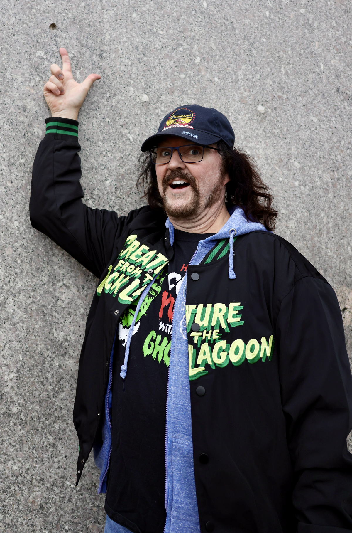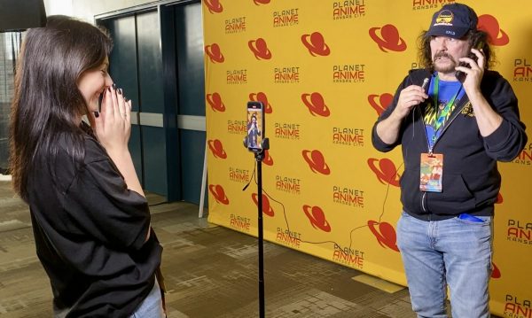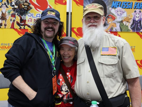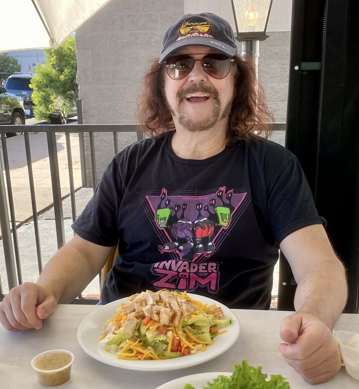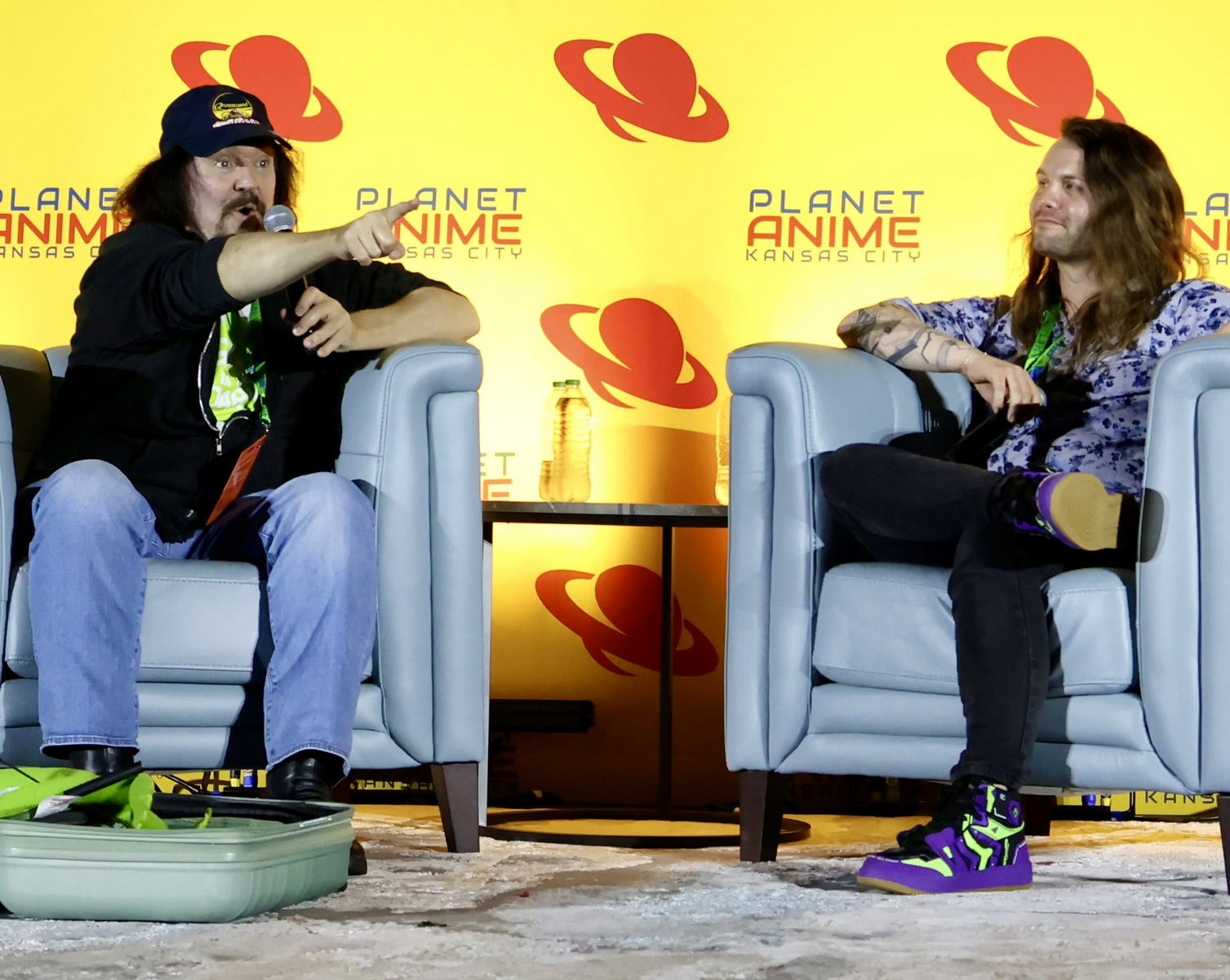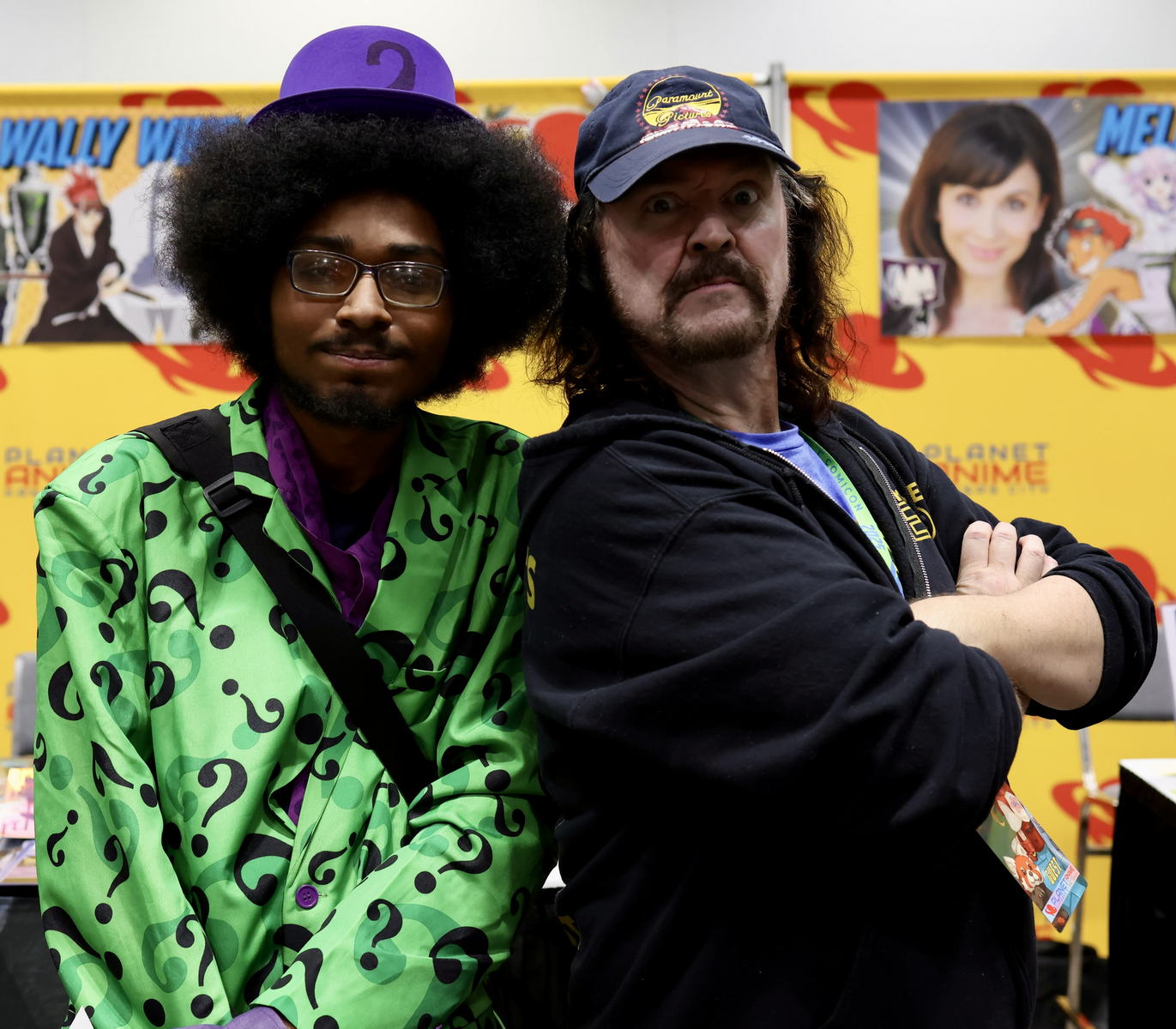 Saturday the 22nd – PLANET ANIME KANSAS CITY: DAY 1! – Just after 10am Mark arrived at my hotel lobby and we were walked over to the convention. Luckily, Mark was given an all-access pass so he could shoot photos at will whenever and wherever he wanted. I was introduced to Lance, who would be my assistant for the weekend. I named him Lancelot because he was so gallant and effective. As is common in the Midwest, the people were very, very nice. I had a great time meeting everyone. Just before noon we were walked over to the panel stage for the “Invader Zim” panel, and I was soon joined by my “Zim” cast mate Melissa Fahn. Though there were only two of us we would make sure the Zim fans in the audience had a great time. Just before the show I decided to take a potty break in the backstage bathroom. When I came out one of the locals said, “Did you like the urinals with no partition between them?” I said, “What?” I went back in and sure enough, the partition between urinal 4 and urinal 5 was gone. I got a funny idea. When going to these conventions it’s my habit to try and do something so outrageous and funny that it’s talked about years later. At one convention I had pizza delivered by Domino’s during the panel. I had some pieces leftover, as very few of my panel mates wanted to partake, so I had audience members come up to the stage and grab pieces of pizza. The moderator was a guy named Zach Wilson, and Zack and I had spoken via Zoom many years ago for an on-line interview. I asked Mark to grab his camera, and I asked Zack to join. The picture we took speaks for itself, but I like to call it “Peeing With Partners.” Everyone got a great laugh out of it, and the word spread quickly. (I know what you’re going to ask, and the answer is no.) I’m sure many KC con-goers will be talking about “Peeing With Partners” for a long time to come. After the panel it was time for lunch, and the con had catered in delicious Kansas City barbecue from a well-known restaurant called Q39. It was fantastic! As I got back to the convention floor, I saw that my friends Steve and Winnie Van Dyke had arrived. I gave them both a big hug and invited them to stay and watch while I did some signing, and posed for some photos. They stayed around for a little while, but since it was their first “con” experience, they wanted to go looking around. They ended up having a GREAT time, and even bought a few things! During a break, I took Kermit out on the floor for a while to have some fun. Kermit had some fun with May Hong of “K-Pop Demon Hunters” fame. My granddaughter Natalie is nuts about that movie, so I’m going to get an autograph and video shout-out for her on Sunday morning. But her line is always so long! I got a signed pin-up and video shout-out from Gabe Kundun, who plays King on “One Piece.” My grandson Elliot had requested it. Mark continued to take a ton of pics and video, I got great gifts from a lot of fans, and it was great to see so many “Tiger and Bunny” cosplayers! I’m hoping that means that the show (which I truly adore) is getting more fanlove! As I spoke with a few female “T&B” fans, they explained to me that most of the female fans are into the heroes’ secret identities; Kotetsu and Barnaby. They like Kotetsu particularly, because they feel he’s a good guy and he’s funny. That would explain why I sign mostly Kotetsu stuff for the ladies, and the guys like to have Wild Tiger stuff signed. It totally made sense! I also met two sisters named Rachel and Jordan who had driven 3 hours to meet me and my “Bleach” cast mate Dan Woren. Unfortunately Dan had to cancel at the last minute for a medical reason. So I spent some time chatting with them and admiring their Soul Reaper costumes. I loved all the nice people I met from the area. Really top quality people! The convention ended for the day so I headed back to my room to freshen up. The guy at the front desk suggested Mark and I hit a place called Grinders for casual sandwiches and pizza. But when Mark booked an Uber to take us there, he took us to an empty building. Apparently Uber’s mapping system hadn’t updated to the new address. And also, it seemed like there were several Grinders to choose from. There was a restaurant, and there was a bar – both with the same name. We found an alternate address and when we arrived it was pretty unspectacular. The bar was to the left, and the dingy little restaurant was to the right. We walked in and the atmosphere seemed sub-casual, but we stayed anyway – keeping in mind the hotel desk clerk’s recommendation, and the fact that he said that Guy Fieri had given them some sort of recommendation for their Philly Cheesesteak sandwich. The music was extra loud, and extra annoying – bordering on torturous. I didn’t recognize one song, and it all seemed angry and abrasive. We put our order in (me a pizza, and Mark was going to try the “award-winning” Philly Cheesesteak sandwich), but the waitress didn’t write down the order. In fact, when she repeated it back to us she got it wrong. Uh oh. After about a half hour, we still hadn’t gotten our order. But yet people who had come in after us were getting their orders. Something was up. Either the waitress forgot to submit our order, or something else was awry. After about 50 minutes I got up and asked a guy who seemed to be the manager if things were getting close to being served. He said, “Well, ya know, it takes about 25 minutes for a pizza to be finished.” I told him we had been there 50 minutes already, and could we just get our food to go. The abrasive, annoying music was getting to us and starting to ruin our day. If the restaurant thought they were being hip and edgy with their horrible choice (and ear-bleeding level) of music, they were sadly mistaken. It was more likely they wanted to close and were hoping to drive everyone out. If so, it was working. We finally got our order and
