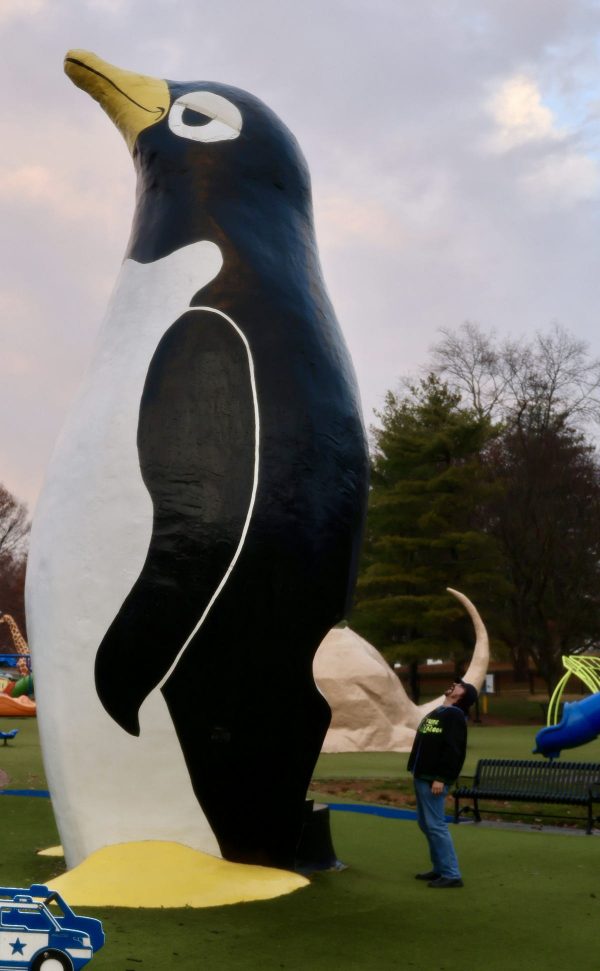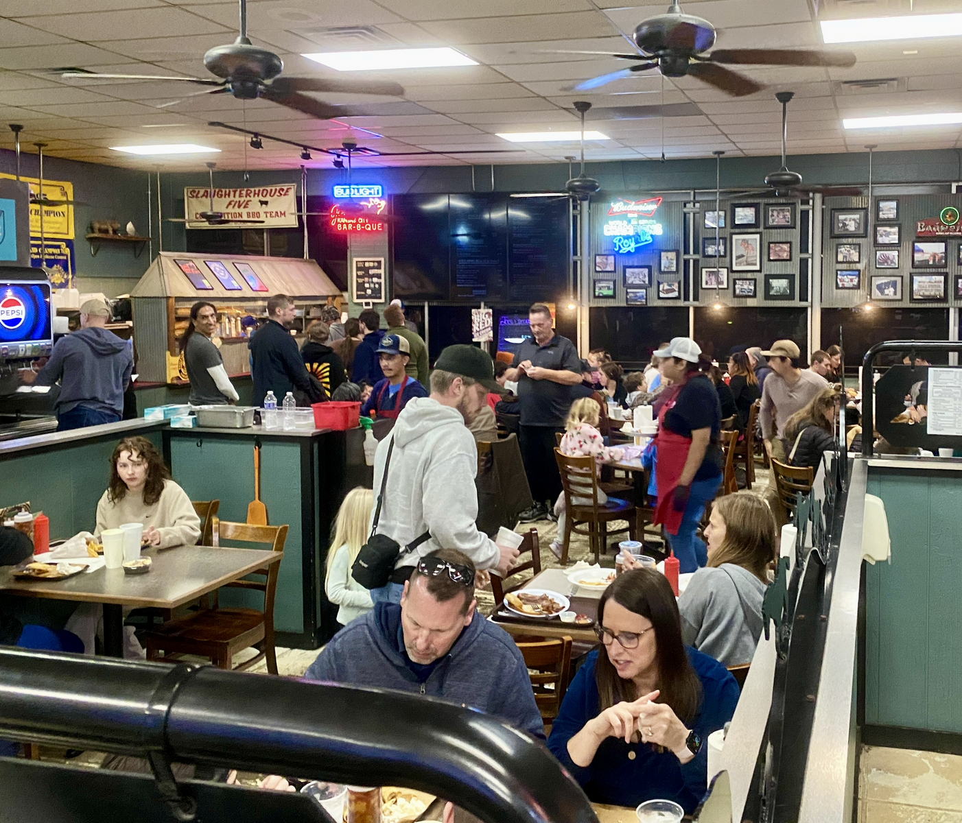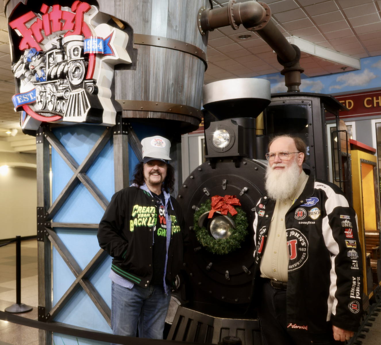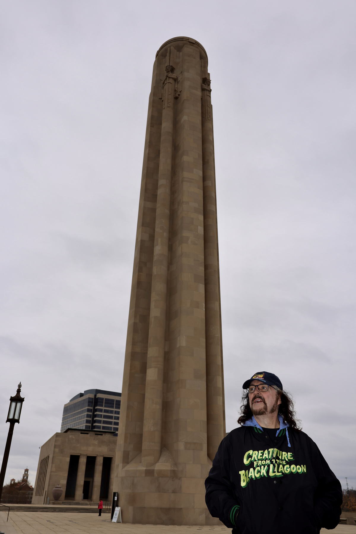 Monday the 24th – TOURING THE TOWN! – It sure was nice to have a day to sleep in. Around 12:15 Mark had made his way over to my hotel, and Steve picked us up around 12:30 to start our tour. The first stop was the fantastic World War 1 memorial. It also gave us a fantastic view of Kansas City. For a period of time, Steve drove for Uber. So not only did he know the streets and layout of the city really well, he also had an encyclopedic knowledge of the town’s history. We could NOT have had a better tour guide! We saw some more sights, and then headed to a fun restaurant called Fritz’s where your lunch was delivered by a little model train. Kitschy and cool! Then we looked around some more, and took a walkway over to Union Station. It was on this site back in the early 30s when some law enforcement officials were transporting notorious gangster Frank Nash to the prison in Leavenworth, Kansas. But “Pretty Boy” Floyd and his gang showed up at Union Station in an attempt to free Nash. In the process of shooting the place up, they unintentionally killed Nash, along with a few of the law enforcement officers. We saw one of the holes in the marble panels outside where a stray bullet had made its mark. Amazing history! Union Station was beautiful; made even more stunning by all the ornate decorations for the Christmas season. I found a store that sold KC Chiefs merchandise, so I bought a hoodie for my dad for Christmas. He had a good buddy who loved the Chiefs, and by osmosis he started following them as well. My dad has started his workouts again at the local Wellness Center, so I thought the hoodie might be fun for him to wear during his workouts. While we were in the facility it started to rain fairly heavily. We drove around some more to see some more sights. Between the moody, rainy day – and the great music Steve was playing on his radio – it really created (what the kids call) a “vibe.” It was nice and memorable! We eventually picked up Steve’s wife Winnie after she got off work. We headed to a place called “Joe’s” – a gas station/BBQ restaurant that’s legendary. Though we had to wait for a while, we got seated and had an amazing meal! YUM! Steve delivered us back to our hotels, and I got packed up and readied myself for the trip back home early Tuesday morning.