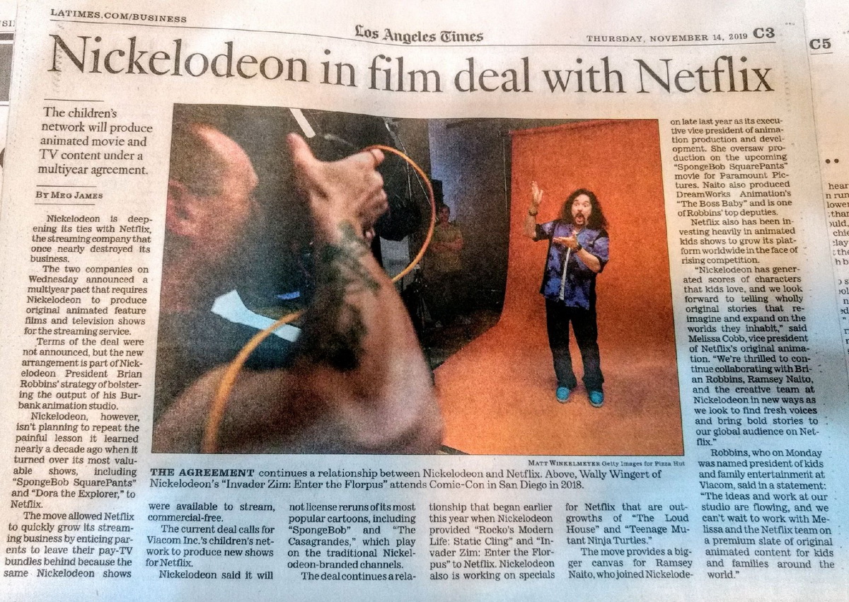 Wednesday the 27th – BAD NEWS FOR NEWSPAPERS!? – Shortly after noon I sped off to my box to pick up some packages, and then I went to the post office to mail some things. I came back home to work on recorder 12 (I’m trying to get these all transferred before the holiday season gets into full swing so I can have them out of the way) and ended up working all evening on them. It’s truly tedious, laborious and arduous work. When my eyes started blurring I decided to grab a short nap. When I got up later my pal Ed had texted me a photo of an article that appeared in last week’s LA Times. It was about a big Nickelodeon and Netflix deal that had been struck for content creation. The photo they used in the article was a picture that was taken at last year’s San Diego Comic Con. Four of the Voice Actors from “Invader Zim: Enter the Florpus” (myself included) did a photo shoot before our publicity excursion during a day at last year’s con. Not sure why the Times decided to use a picture of a photographer taking a picture of me at the photo shoot for their article, but I was happy they did. But in the ‘old days,’ when you had your picture in the paper, all kinds of friends would call to let you know you were in the paper. The date on the article was November 14, 2019…a full 13 days ago! I guess nobody’s reading newspapers any more…except my friend Ed. If the newspaper’s readership was what it used to be, somebody would have no doubt called me that very day. But I was happy to be notified about it, and even more ecstatic to have a color picture in the L.A. Times! I worked on recorder 12 some more, and made some good headway. It rained off and on all through the night, so I drove over to Denny’s to get some food to go. I came home and watched another episode of “Police Woman” and ate my food. As it approached early Thanksgiving morning, it rained really hard!