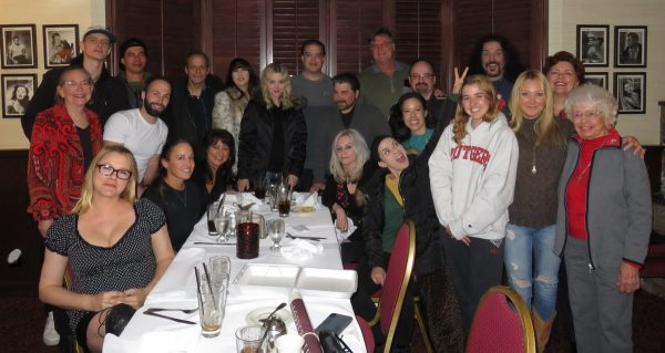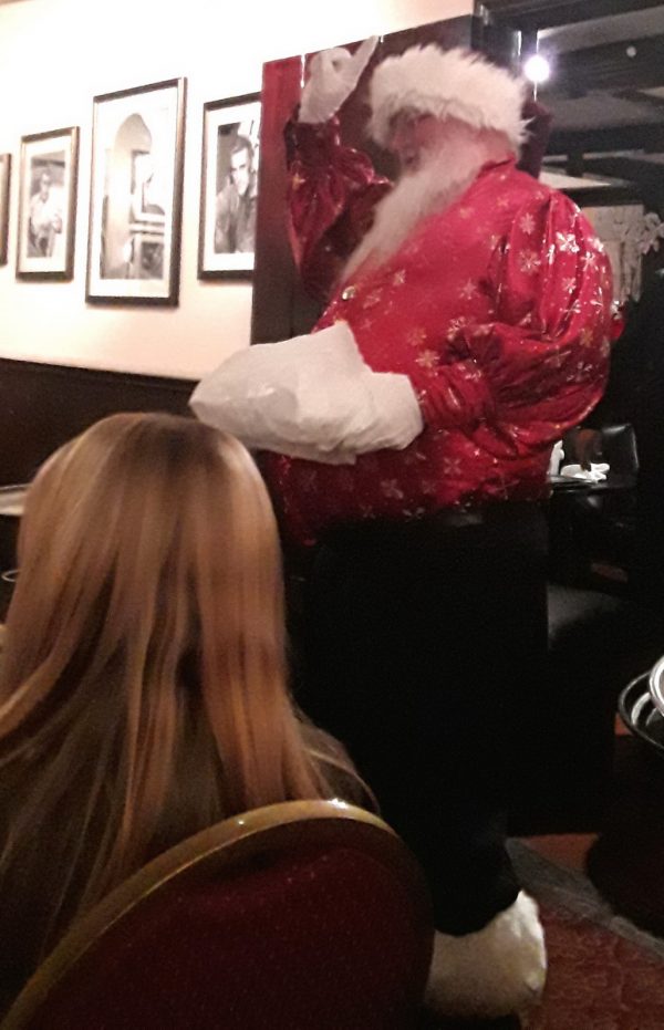 Thursday the 28th – HAPPY THANKSGIVING! – This Thanksgiving was really one for the books! I got up around 2, worked on recorder 12 a little bit, and everything was transferring smoothly! The ol’ memory on recorder 12 was having a good day. I was kind of thinking that the cooler conditions may be better for the player? Not sure if temperature affects those kinds of things or not. I dug out a bunch of little index cards and pens for our annual Thanksgiving tradition. Each year after dinner, I pass out cards and pens to everyone at our table and ask them to write down (anonymously) one random thing they’re thankful for. It doesn’t have to be an important thing, or a vital thing, just one random thing. Then I collect up the cards and read them out loud to the table. Some are funny, some are heartfelt, some are poignant. But it’s always fun, and we’ve been doing it for about 10 years now. My pals Scott and Vickie Sebring dropped over, and then we went to pick up our friend Sara, and we headed to the Smokehouse. By the time we got there most of our gang had already arrived and were seated! There were so many of us they had us at two really long tables! It was magical! The Smokehouse had us in their front room off to the side, in order to accommodate our large group. So we had a clear view of all the other customers who were coming and going through the front door. Wouldn’t you know it, SANTA CLAUS was there too. He came in to say hi just before he left, carrying his Smokehouse leftovers in a plastic bag! Of course Santa loves good food! How do you think he got so girthy?! He stopped in to say hi to everyone and we gave him a huge round of applause! My pal Edi thought I had hired him to appear, but I swear I didn’t! He was just there eating like everyone else! Honestly, it made me feel just like a kid again. As it did everyone else in the room. Magical! We were an international group too! Three of our group was from France, and one guy was from Serbia! Amazing! Then the time came to write down the one random thing we’re thankful for. I passed out cards and pens to our group and everyone started writing. I gathered up the cards and read each one out loud. Now, in addition to the two tables for our group, there was one other large table in the same room with eight other people that we didn’t know. After I read each one aloud our group applauded loudly. And the people at the OTHER table applauded as well! I said, “Do you guys want to play too? I have some extra cards!” They said they would love to, so we took a short time out so I could distribute cards and pens to them. I gave them a little time and then collected their cards too. One of the cards I read said, “I’m thankful that a group of total strangers let us play their game with them.” We all laughed heartily at that! What a magical Thanksgiving! As our three hour Thanksgiving celebration drew to a close, it was raining pretty hard outside. I wanted nothing more than to go home, turn on the fire, turn on some Christmas music on the satellite, and begin my month of “Christmas Nappies” by listening to it pour outside. I started calling it “Christmas Nappies” many years ago when I had my dog Sassie. At that time my couch wasn’t on a riser, and Sassie could get up on the couch with me and nap. I started calling it “Christmas Nappies” when I would entice Sassie to come up with me and relax. She knew the words “Christmas Nappies” and responded to it every time. Even after she passed away, I kept the name. Even though my couch is on a riser now, and Roxy can’t get up that high, it’s still fun to keep the name. I turned on DirecTV and tuned into channel 815; the Sounds of the Season channel. In the past, I’ve had issues with some of the music on these channels. Annoying novelty songs and loud, screamy Christmas songs would wake me out of my dreamy Christmas vibe. But I heard McCartney’s “Wonderful Christmastime,” (my third favorite Christmas song) and “Step Into Christmas” by Elton John (my second favorite Christmas song). No screamy songs, and no annoying novelty songs. NICE! I got up to feed the kids, walked Roxy, and then I went to bed around 7am on Friday. This was one of the best Thanksgivings ever!