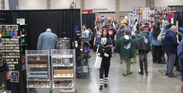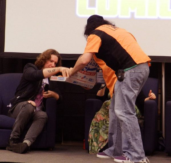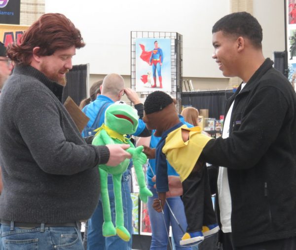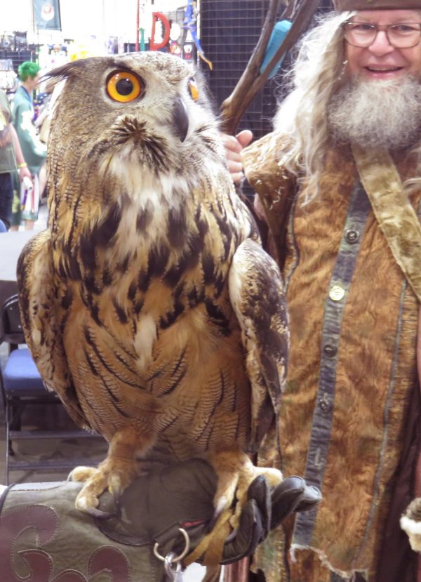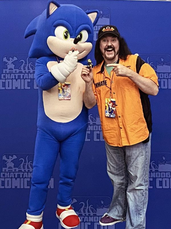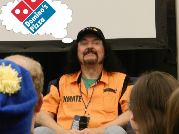 Saturday the 21st – CHATTANOOGA COMIC CON: DAY 1 – CHATTING IN CHATTANOOGA! – The convention started at 10 and my assistant Zach and I headed to my table to get set up. As I was walking around the con, checking it out before it got busy, I saw a woman with a huge, beautiful white dog. I asked if I could take a picture of it. She said that the dog wasn’t actually a dog, but was a wolf! A wolf rescue called Wildefell Wolves was there doing photo ops, but she said she wouldn’t charge me for a photo since I was a guest. But I insisted on paying full price for the photo, as I felt their rescue was a really great cause! The wolf was gorgeous and very nice, and I also met a beautiful owl with bright, orange eyes. The feathers were simply magnificent, and the owl was easily two feet tall. Later, the handler brought her by my table so I could pet her. I noticed she was doing something that looked like panting. The handler said owls ventilate much like dogs when they’re warm. He told me to feel under her wing, and although I was hesitant at first, I did. She was very warm. I asked about her wingspan and her handler stood back, held her above his head and she spread out her wings. Her wingspan was at least 6 feet! Amazing! Although the day was fun meeting all the great people, I couldn’t wait to get back to the Wildefell booth and see one of the other wolves. They brought out a wolf “puppy” (he was 5 ½ months old) for photos. But his behavior was quite different than that of the white wolf, as his youth was clearly showing. He was easily distracted and had difficulty focusing on the handler as we were trying to get a picture. Just as he stopped to focus on the handler I would put my hand on his back for the photo, but he got distracted by my hand and turned around to look at me. Then he started playfully chewing the faux fur rug that was on the bench where I was sitting. Yup, he was definitely a rambunctious youngster. We finally got a great photo and I headed to lunch. The convention had lunch for us at 1, and I had a panel to do at 2. But the lunch consisted of food that wasn’t really my style. I’m sure it was VERY yummy, it just wasn’t my thing. So I decided to go to the concession stand and get a pulled pork barbecue sandwich. But just as I got up to the counter the lady announced that they were out of barbecued meat. Bummer! With only about 15 minutes until my panel, I didn’t know what I was going to eat. My pal Alex Zsolt (who lives in Nashville) had driven over to see me with his pal Phil. I asked them if they would call the local Domino’s and order me a pizza. I’d gladly pay, but I thought it would be funny to have the Domino’s delivery person burst into the middle of our panel and bring a pizza up on stage. Phil agreed to be the one to meet the driver while I was on stage and usher them in. Sure enough, halfway in the middle of the panel, Phil entered with the Domino’s driver; complete with the famous Domino’s shirt! The other actors couldn’t believe what they were seeing, but I figured this bit would be very “Andy Kaufman-ish.” Everyone laughed and I sat there on the panel enjoying my pizza. I offered some to my fellow panelists, but Mela Lee and Tara Sands politely declined. Only Xander Mobus took me up on the offer. Then I walked out into the audience and offered pieces to the fans. Before you knew it, the pizza was gone! I suspect people will be remembering the “pizza panel” for years to come. Hopefully I’ve started a tradition in this new, burgeoning convention! Even people who weren’t at the panel were talking about the “pizza panel!” People were mentioning it when they came up to my table later. I signed for the rest of the afternoon at my table, and then when the convention closed I headed back to my room to freshen up. My friend Natalie and her husband Sam and their family have lived in Knoxville for a while, and they drove over to join us for dinner. Natalie was an editor at Pax TV 20 years ago when I was the voice of the network. It was good to see them again! We were joined at dinner by about 10 other people from the convention, including Lauren Tom, Billy West, Marty Grabstein and others. What a fun evening. The weather was perfect out, so I’m glad we got a large table on the patio and enjoyed the gorgeous Tennessee evening. We got to talking about Alex’s career as a concert pianist, and some of the people at the table got very curious about his talents. I asked our server if the restaurant had a piano. She said they didn’t, but the Westin across the street did! My goal was to get a group of people across the street after dinner to have Alex play a little something. But when we got there a musician was performing with her guitar, and we didn’t want to wait around until she took a break. It was getting late, and not only did Alex have a long drive home, Natalie and her family had a considerable drive as well. Oh well. I got back to my room and packed some stuff up and prepped for the final day of the convention.