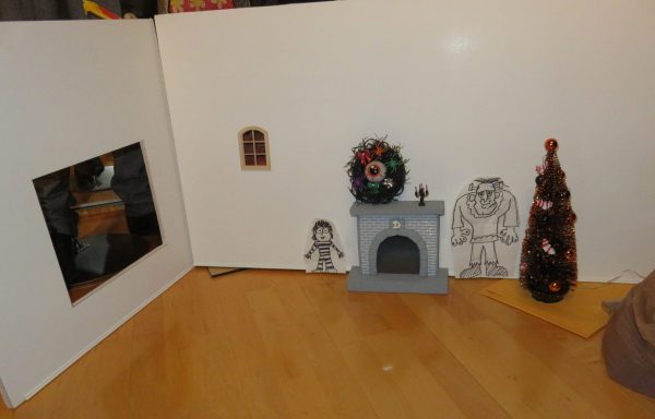 Sunday the 6th – NEARING COMPLETION! – As usual I slept all day and relaxed. Later I fed Spook again and he devoured his magic goo. I recorded some fun auditions, and then I took a WOG and spent some nice time in the anti-grav chair enjoying a nice cigar. My warm, summery cigar nights are coming to an end soon, so I have to enjoy them while I can. I scanned some checks for my monthly bank deposit, and then worked on the set walls for the Christoween stop-motion video. I cut the apertures in the walls where the windows will be. On Monday I’ll get some paint for all the interior trim and start on finishing everything up. Once the interior walls get painted I’ll start decorating them with specific Christoween decorations – ala candy canes painted like candy corn, and little skulls with Santa hats on them. FUN!
