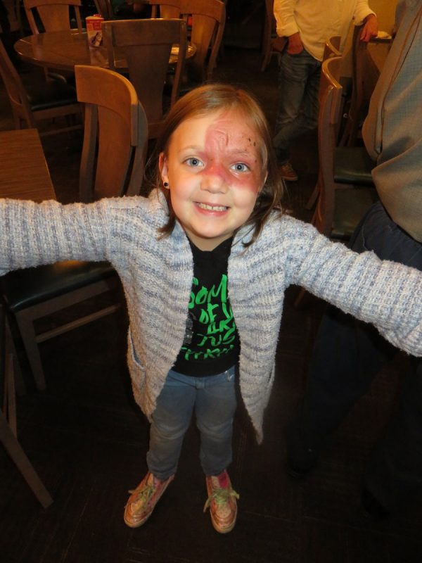 Sunday the 19th – FALL HAS FALLEN! – A gorgeous, crisp, sunny fall day greeted me when my pal Dave Baumeister came to the hotel. It was pretty much the quintessential Midwestern fall day. We walked over to the DQ that was in the area to have lunch, but we were shocked to find out that they no longer had footlong chili dogs! Oh well. We chatted for a bit, and then Dave decided it was such a nice day he was going to go mow his lawn. I headed over to FedEx to ship some photos and artwork (and the Popeye mask!) back to my house. There was no way I could get these items in my luggage without them getting damaged. So they should be in L.A. by next Friday. I headed back to the room to take a quick nap, and then I met Lacey and her family for pizza. As we sat around I got some paper and pens and had the grandkids draw what they were going to be for Halloween. Now I have original artwork from each of my grandkids! Sweet! When we finished eating we all said our goodbyes and hurried to our cars because it was darn chilly! I got back to the room and started packing up for my exit on Monday. What a great trip!