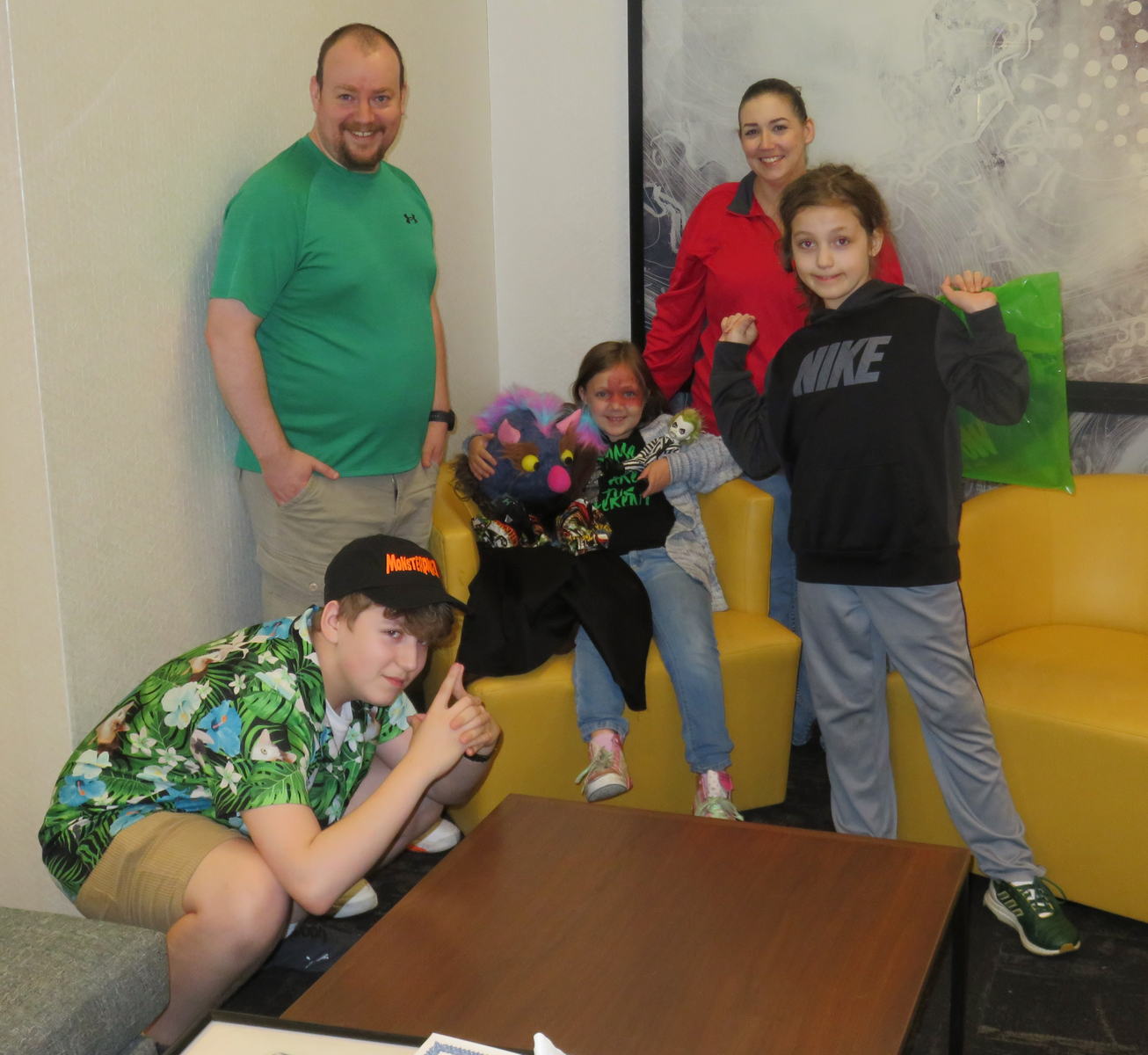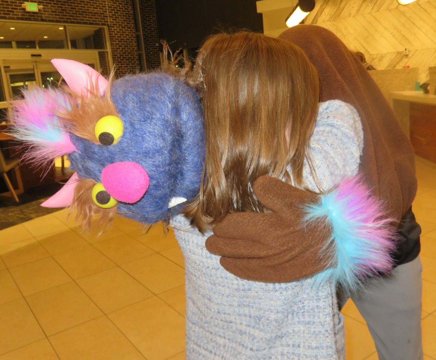 While my grandson Devin puppeteers the new custom puppet “The Monster Who Lives Next Door,” Natalie welcomes him to the family with a welcoming hug.