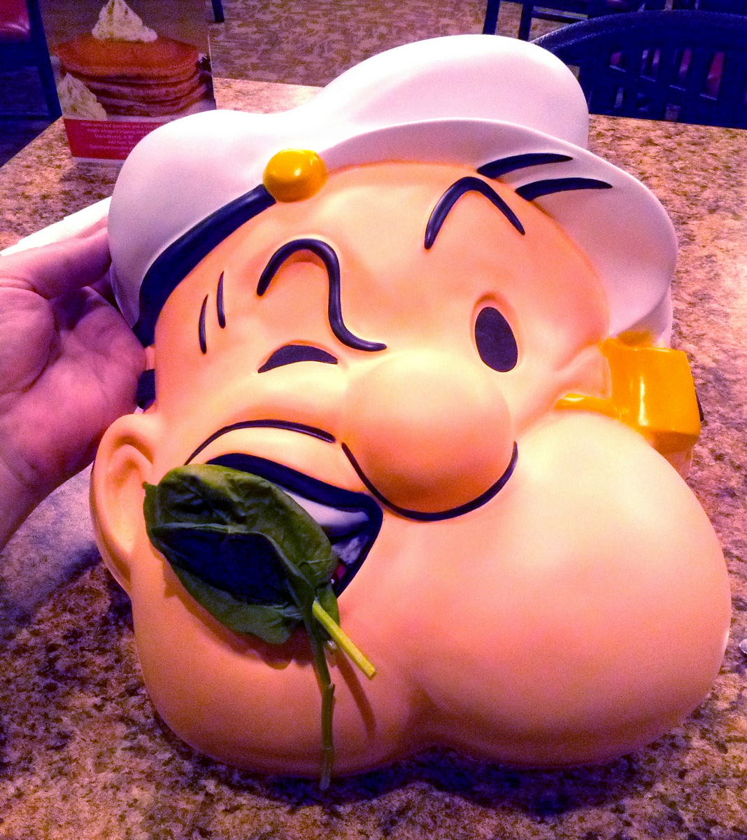 Thursday the 16th – SAFE AND ON-TIME! – Unfortunately I didn’t get to bed until 1am, and I had to be up at 6am to be at the airport. But I never sleep well the night before a flight, so my eyes shot open at 4am and I couldn’t get back to sleep no matter how hard I tried. So, I figured I’d get up and get at it. I drove to the airport at 7am, arrived at 7:30am, checked my car into the valet, checked in for my flight, went through security, and got some breakfast. I pulled my cap down over my eyes and slept all the way to Denver. I’ve never had trouble sleeping on a plane, and once my noise-canceling headphones go on, the toonz start up, and the cap goes down over my eyes, I’m out! When we landed I had to walk about 70 gates away to get to my connecting flight to Sioux Falls. Once there I got a sandwich and boarded the plane. There was a VERY loud woman sitting a few rows ahead of me and the entire plane could hear her. So I popped on my trusty noise-canceling headphones, cranked the toonz, and ate my sandwich. We arrived in Sioux Falls a few minutes earlier than expected, and as I always say – the only two things I expect out of a flight are for them to be “safe” and “on-time!” The day’s travel went swimmingly! While I waited for the luggage to hit the carousel I went to the car rental counter and got my vehicle. They asked, “Is a Jeep Wrangler OK?” Not thinking I said, “Sure.” I had never driven a Wrangler before and it was…different. It sure looked cool though. After I got my luggage I headed to the hotel to check into my room. First it was a quick stop at Walmart to pick up some supplies. I found a wonderful, oversized Popeye mask! I’m not sure how I’m going to get it home, but I grabbed one anyway. I got to the Fry’n Pan and spotted my sisters and dad eating at a table by the window. So since it’s almost Halloween, I put on the Popeye mask and stared at them through the window. The whole restaurant got quite a charge out of it. When I went inside to sit down, one of the servers brought over a cup of spinach and said, “Here, you might need this.” Hilarious! I had a fun dinner with my dad and sisters and brother-in-law Roger. After a hearty Midwest meal of a hot roast beef sandwich, I headed back to the room to turn in.
