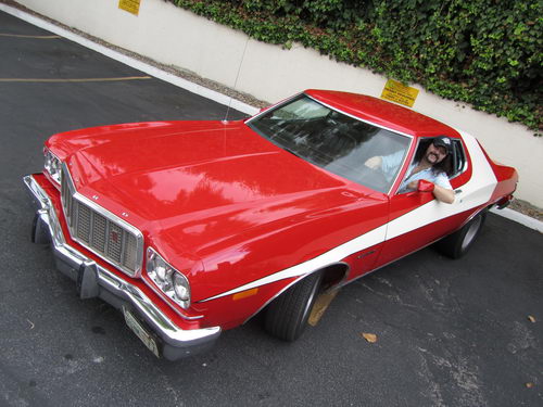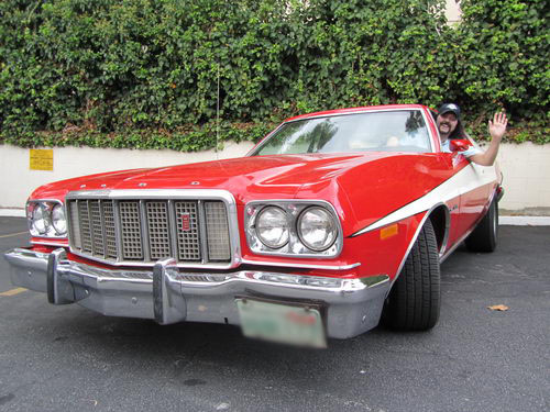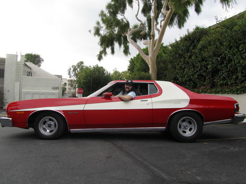 Saturday the 23rd – THE WORLD IS UPSIDE DOWN! – More chaos today. I got up and when I walked Sassie I noticed a squirrel curled up under the hedges by my mailbox. I think he may have gotten into some old catfood that was left out. He was breathing heavily and not moving much. I called my assistant Sara to see if she could take him to the local animal hospital and get him treated. I had to wait around the house for a garage door repair guy to come. My broken spring still wasn’t fixed so I was still lifting the door by hand. My neighbor Bob came by and wanted to get my thoughts on a personal matter he was having, plus I needed to return the parking pass to my neighbor who loaned it to me the night before for my Torino. I was talking to Bob, getting updates on my phone from Sara, and the garage door guy called me to say he was lost. Not sure why this all has to happen at the same time, but luckily I was handling it calmly. Bob got the answers he was looking for, Sara got to the animal clinic and was waiting for answers, and I showed my Torino to my neighbor who loaned me the pass. Then another neighbor pulled up in his SUV to say that he lives across from me and that his wife was scared of me. I asked why. His living room window looks into the windows of my office area. I had come in last night from the jacuzzi in my swim suit and before changing decided to do some e-mails. I guess his wife didn’t like seeing me in my swim trunks through my window, and was offended. (I believe that these particular neighbors aren’t originally from this country and their culture may be different than ours in this regard) Gee…I was actually kind of hurt by that. But oh well. I explained to him that I came in from the pool area and decided to do some work before changing. And if she’s that offended she probably shouldn’t ever go to the swimming pool because she’ll see that and probably much worse. He said it wasn’t cool that I was running around MY OWN HOUSE in my swimsuit. I said I was sorry, but it was my swimwear and there wasn’t much I could do. Perhaps the thought never occurred to him that maybe he should draw HIS OWN CURTAINS instead of letting his wife stare out the window. Geez. Some people. I called my friend who owns the place, as she now lives in another state and is renting to these people. She thought it was very odd too, but like me, wrote it off to cultural difference. Sara got stuck at the animal hospital so I took her over some lunch and to wait for the doctor’s diagnosis. Come to find the little guy had some head trauma. It wasn’t the old catfood at all. He must’ve gotten hit, or fallen or something. The vet was very understanding and could tell that I was sad by the whole thing. I had to sign the paper to allow them to put him down. I had never done that before and it made me even sadder. But it was all for the best. She said that even though she would have given him antibiotics and steroids, he still may not have improved, and even still would have had to be fed with a syringe. The bike ride home was a very sad one. So I got in my new Gran Torino and tried to get happy. That was my happy place for today. Sitting in that car smelling the old interior, hearing the engine roar, made me happy for some reason. I had always wanted one of these cars and now I have one. It’s awesome. My friend Chris came over to take some shots of me in the car.