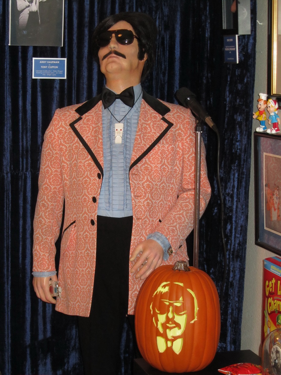Wednesday the 23rd – BOWLED OVER BY A BOWLING SHIRT! – The hotline rang at 10:30. It was my agent informing me that copy for a “TS” bit was forthcoming. I told her to buzz me back when it was in my in-box, and I promptly fell back to sleep. I got up around noon-thirty and walked Roxy, then recorded the bit. I showered and headed over to Cypress Park to visit with my seamstress Karyn. She had finished a Tony Clifton bowling shirt I had designed. I scanned the famous orange damask pattern from my 1970’s-era Lord West tuxedo, similar to the one that Andy Kaufman first started using as Tony Clifton (which became his trademark). I uploaded the pattern to an on-line fabric printing company, and had several yards printed in a cotton sateen. Very nice shirt material! And now I have a bowling shirt that looks very close to Clifton’s famous tuxedo! The collar is black velvet too! The shirt turned out amazing! I can’t wait to see it finished once it gets all the embroidery done on it! Outstanding! I stopped by the Burger King drive-thru and picked up a chicken Parmesan sandwich. I figured out a way to order them so they’re fresh. Tell them you want one with extra marinara sauce, and they have to make one fresh! I love the sandwich, but the first few I bought when they were first introduced were chewy and tasted like they had been left under the heat lamps too long. I made my way back to NBC and opened the show. One of the guests was none other than the legendary Harrison Ford! It seems like he always comes on the show when it’s close to Halloween. The last time I remember him being on, one of the comedy features was doggie Halloween costumes. And I remember seeing Harrison in the hallways looking over the little doggie wearing the Indiana Jones costume. Fun! As I was about ready to leave the stage I saw a guy heading to his car with a large case. He looked really familiar. I asked Tony the security chief, “That guy looks like Kenny Myers, a make-up artist I know.” Tony said, “It IS Kenny Myers.” I ran outside to say hi. One of the first things I did when I got to L.A. was to work on the film “Return of the Living Dead Part 2,” which shot up in Valencia. I was working all day at the Westwood One Radio Network, then I drove up the 5 freeway to shoot all night as a zombie extra. Kenny was the make-up artist on the film. I introduced myself to him and he shook my hand and gave me a big hug. He’s come so far since then. He’s now Harrison Ford’s personal make-up artist! I told him I had fond memories of those few days working on “ROTLD2.” He did as well. He took my card and promised to get in touch after he’s done traveling with Harrison on the “Ender’s Game” publicity tour. (Hmmm…I wonder if he still has the zombie headpiece I wore in the film? I wonder if he’d like to…SELL it?) I dashed off to Mr. Stitch in Sherman Oaks with my new Tony Clifton bowling shirt. I needed to get some embroidery done on it. Over the front pocket I wanted the name TONY stitched on, and across the back I wanted the Tony Clifton logo embroidered on. I had downloaded the logo from a website, and turned it into an image file so they could digitize it. Dean, the owner, figured full embroidery would be too heavy on the fabric, so we agreed on having an applique made. Instead of embroidering black and blue threads on the shirt, he would embroider blue threads on a black vinyl background. Then after the logo is embroidered on to the vinyl, the vinyl would be trimmed to size and then stitched on to the shirt like a patch. I can’t wait to see it finished! The blue thread we chose is really going to POP against the orange damask pattern fabric! I dashed back home and fed Spook and walked Roxy. Then I drove over to Marie’s in Studio City to meet with Jeff, the son of Pastor Louise at my church. Jeff is about 19 and had expressed interest in voice-over, so he wanted to get the facts from me about how to get started. After a fun chat I headed back home to settle in for the night. I cranked on the fireplace, took a dip in the Jacuzzi, then grabbed a nap on the couch. When I got up I scanned a bunch of checks to prepare a deposit, did some work on my database inputting new DVDs and CDs, and then made some Buffalo Mac and watched another “Kojak” episode. (Incidentally, using Original Cheddar Kraft Deluxe Macaroni and Cheese makes for rather lackluster Buffalo Mac. I always preferred the Sharp Cheddar, but it’s impossible to find any more. Sad. But a quick trip to Buythecase.com settled that matter! GOD bless the internet!)