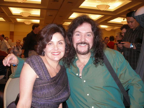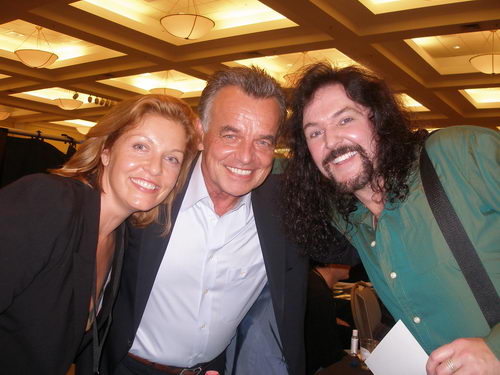 Next I moved to Ray Wise who played Leland Palmer, Laura Palmer’s father. What a great guy he is! Lotsa fun. Then I moved on to the stunning Sheryl Lee who played Laura Palmer. I got a signed pic (the famous Laura Palmer prom photo) and took a pic with her. But when Ray Wise saw us taking a photo he said, “Hey Wally! Why no picture with me?” I told him I only wanted the hotties of “Twin Peaks.” Ray said, “I’m not a hottie?” My pal Sara said, ‘Yes you are.” And he nudged in between Sheryl and I and we all laughed ourselves silly as Sara snapped the pic.