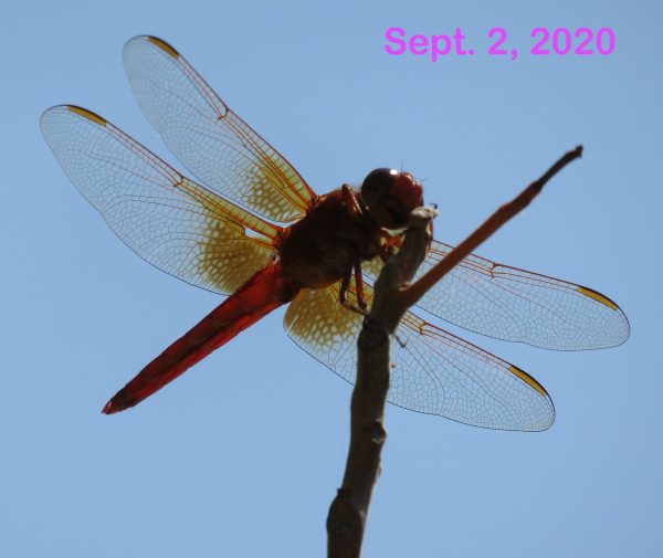 Are dragonflies good luck? I saw this one on a branch outside my house this week. Then I remembered that I saw one just like it in September of 2020, in the same tree, on almost the same branch. What are the odds?!