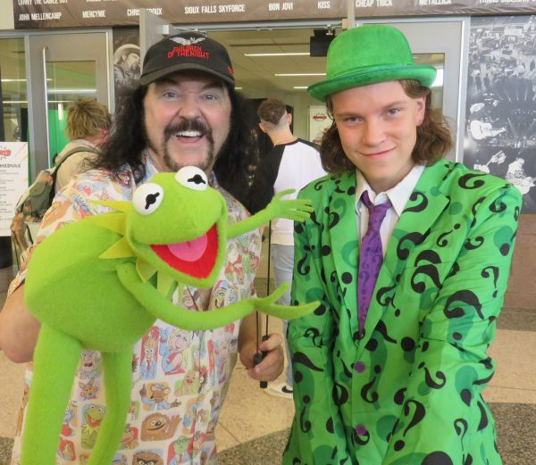 Saturday the 28th – SIOUXPERCON! – My old pal Dave Baumeister would be meeting me at Siouxpercon so we could run around and have some fun. I brought Kermit with me in a black plastic bag. I had intended to keep him bagged up “incognito” until after we had done some shopping, but within a few minutes of getting into the convention I whipped him out to say hi to a couple of old friends. It was fun being at the convention, and since I wasn’t there in an official capacity as a guest, I could roam around and do what I wanted. I had lots of fun with Kermit. I was supposed to meet up this week with my pal Dr. Doom, (Dr. Lou George) my Voices Against Cancer partner, but he called me to let me know that he’s been down with a bad cold this past week. He was going to try and get out to the convention but he wasn’t sure he’d make it. Dave and I went to grab lunch and chat, and after he left I headed back to the convention for a little while. On the way back to my room I got the RAV gassed up for our trip to St. Paul on Sunday. Later I had dinner with my folks, my sister and brother-in-law, and Maguire and his wife Patti. What fun! Phase 2 of my trip begins tomorrow!