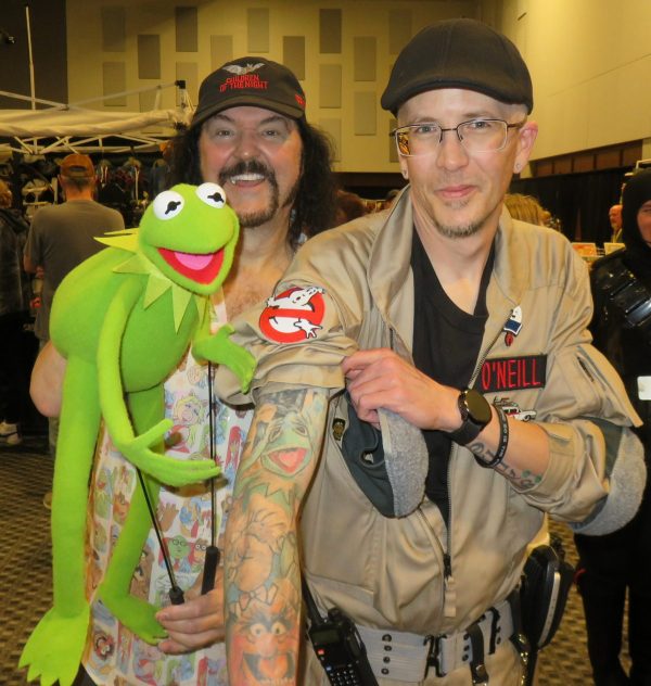 Saturday the 28th – SIOUXPERCON! – My old pal Dave Baumeister would be meeting me at Siouxpercon so we could run around and have some fun. I brought Kermit with me in a black plastic bag. I had intended to keep him bagged up “incognito” until after we had done some shopping, but within a few minutes of getting into the convention I whipped him out to say hi to a couple of old friends. It was fun being at the convention, and since I wasn’t there in an official capacity as a guest, I could roam around and do what I wanted. I had lots of fun with Kermit. I was supposed to meet up this week with my pal Dr. Doom, (Dr. Lou George) my Voices Against Cancer partner, but he called me to let me know that he’s been down with a bad cold this past week. He was going to try and get out to the convention but he wasn’t sure he’d make it. Dave and I went to grab lunch and chat, and after he left I headed back to the convention for a little while. On the way back to my room I got the RAV gassed up for our trip to St. Paul on Sunday. Later I had dinner with my folks, my sister and brother-in-law, and Maguire and his wife Patti. What fun! Phase 2 of my trip begins tomorrow!