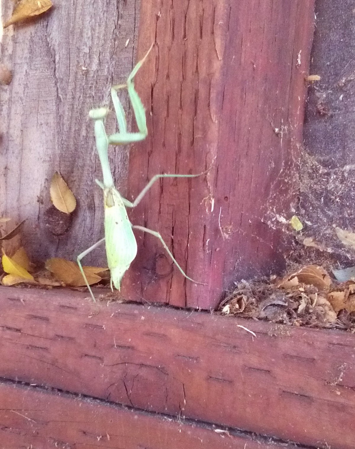 All the while I watched the two guys try to scoop up a wayward Praying Mantis from the parking lot to move it to a safer location, my inner promo announcer voice kept saying, “Toniiiiight…on Mantis Rescue!” Here’s the mantis, safe in the tree away from squishing possibilities.