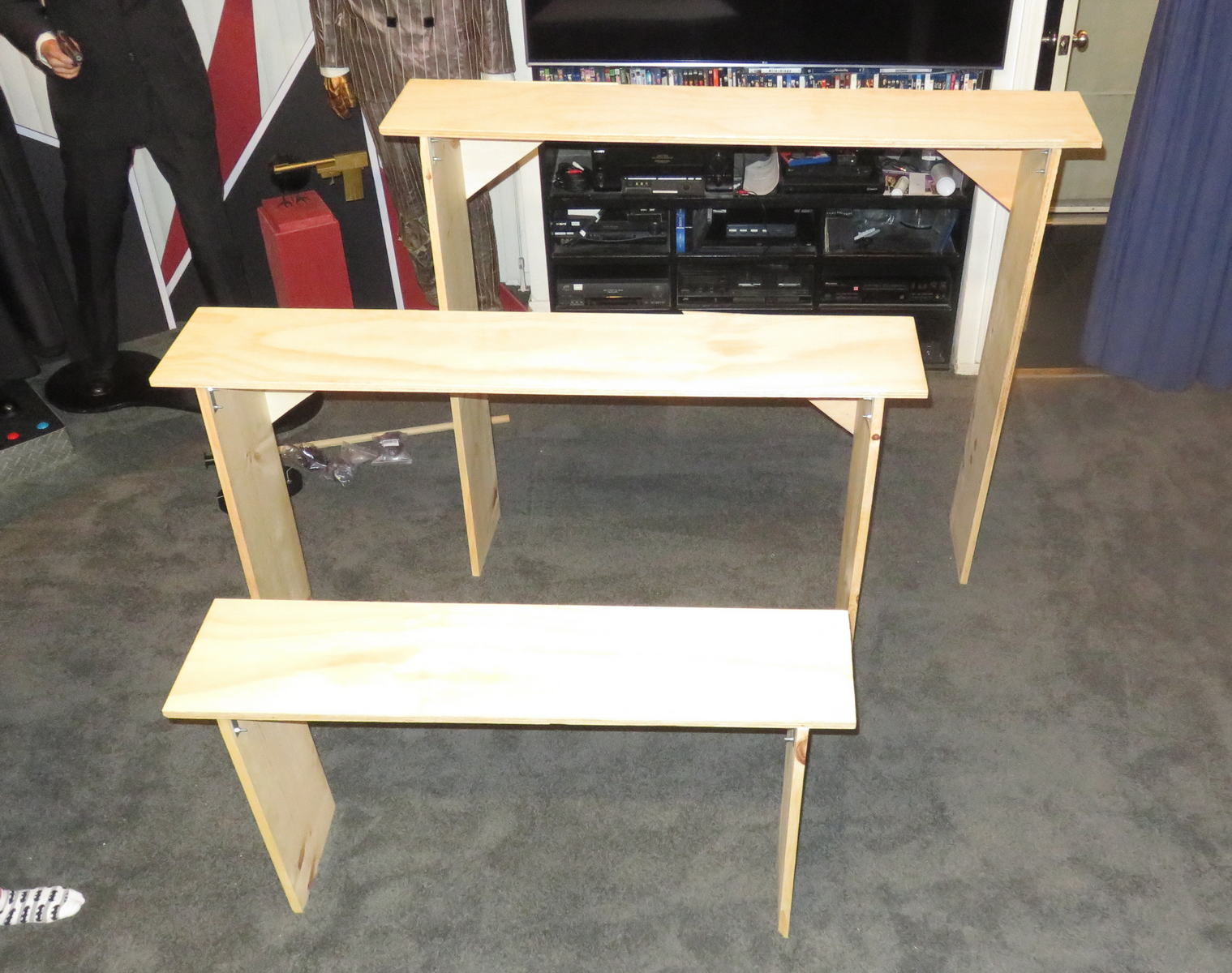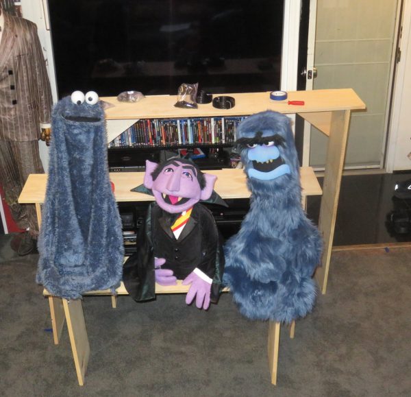 Saturday the 28th – LAYING THE PLATFORMS! – It felt really good to sleep late! When I got up I headed over to CVS to get prints made from the negatives I’ve been scanning. I’m shocked to discover how many prints I’m missing when I inspect my negatives on the light table. But it seems like I may have given those prints away to people when I had them processed back in the day, never figuring I would need them for anything. I came back home and walked over to my stylist Andie’s shop for a touch-up on my color and a trim. When I got back my friends the Pendletons had arrived, just right about the same time my gal Angi arrived! Good timing! We went to Little Toni’s to get dinner, but the wait time was an hour. So we cut our losses and headed to Ernie’s Taco House and got seated right away. They have a much larger seating capacity so they have no trouble seating people on busy nights. Joe Pendleton is helping me create the exhibit for this spring’s Monsterpalooza museum. I’m calling it “Jim Henson: 70 Years of Creatures, Monsters and Misfits.” I’ll have all of my creature and monster Muppet replicas on display and it should look amazing. Jim Henson was responsible for making monsters palatable to younger audiences – and even making them cute and cuddly! Joe built 3 wooden platforms from our specifications, upon which the puppets will be mounted for display. We taped out the available space we’ll have for our booth, and we set everything up to replicate how it will look in the finished exhibit. It was working out VERY well! I brought down each puppet from upstairs and we marked out where their positions would be. Joe will take the platforms back home and paint everything black, and install the wood dowel flanges (the little cup things that will secure the wood dowels to the platforms) to the platforms. The idea is that we’ll do as much work ahead of time so we limit the amount of time we’ll spend setting up the night before the convention. When they left I took a rest for a bit. Then I got up to WOG, and then spent some time outside in the anti-gravity chair. Once again, the weather was unbelievable! I went back inside to continue working on the photo albums. I made a salad and watched an episode of “Fantastic Journey.” My assistant Emily was coming over at 9am to pick up my tax stuff so she could run it over to my accountant, so to kill time I kept working on the photo albums until she got there. After she left I hit the hay!
